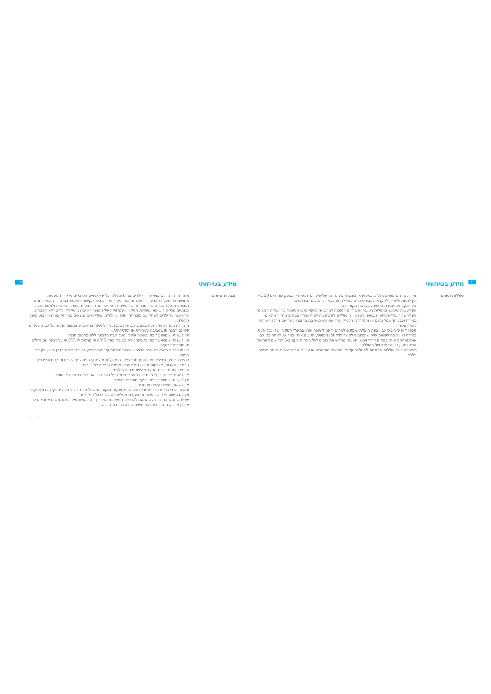 םיחטשמ יבג לע ,חותפ םוקמב שומיש וב תושעל ןיא .דבלב תיתיב הביבסב הפצר יוקינל דעונ הז רצומ .תיתיישעת וא תירחסמ הביבסב וא הפצר םניאש .הנגה םוסחמ אלל הפצרה הבוג לעמ יולתש חטשב טובורב שומיש תושעל ןיא םילזונ םע הפצר לע וא 0°C -ל תחתמ וא 40°C לעמ הביבס תרוטרפמטב טובורב שומיש תושעל ןיא .םיקיבד םירמוח וא תלועפ עוציב ןמזב םהלש הרירג עונמל תנמ לע תאזו טובורב שומישה םרט הפצרהמ םילבכ ומירה