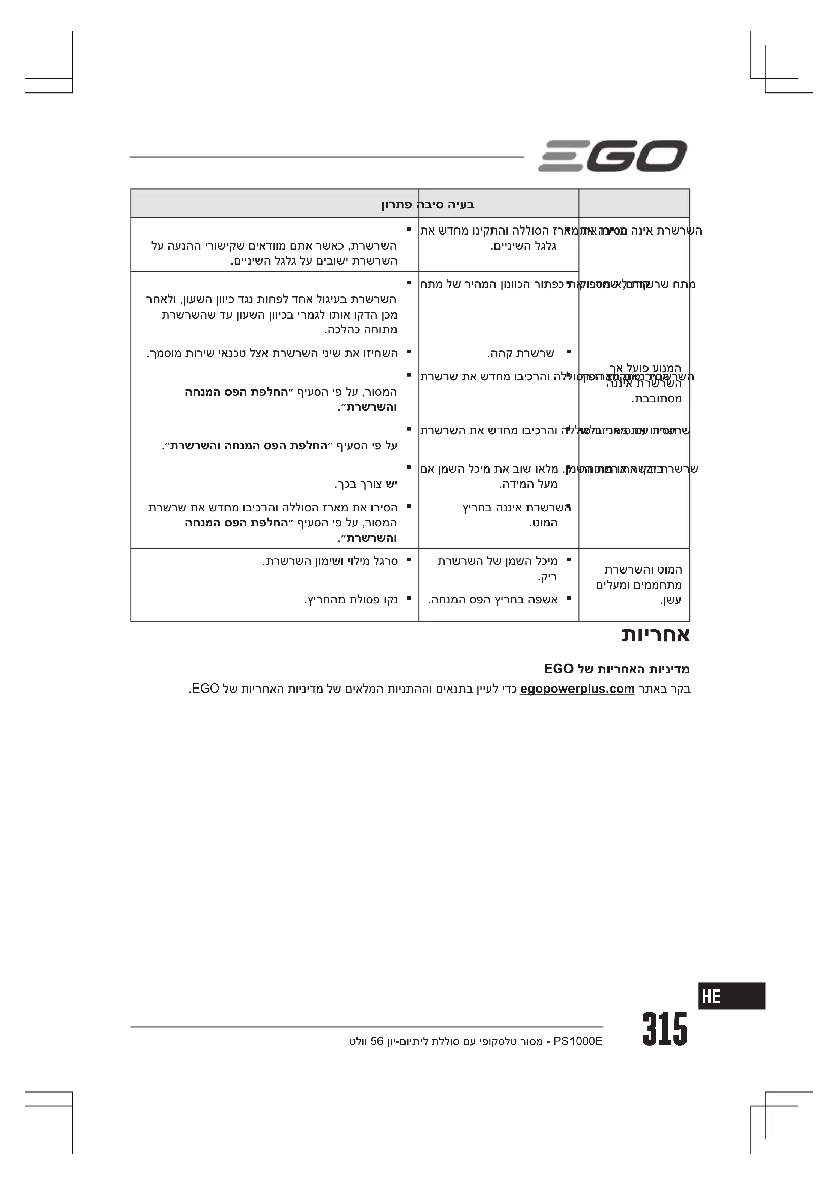 EGO לש תוירחאה תוינידמ .EGO לש תוירחאה תוינידמ לש םיאלמה תוינתההו םיאנתב ןייעל ידכ egopowerplus.com רתאב רקב316 טלוו 56 ןוי-םויתיל תללוס םע יפוקסלט רוסמ - PS1000E