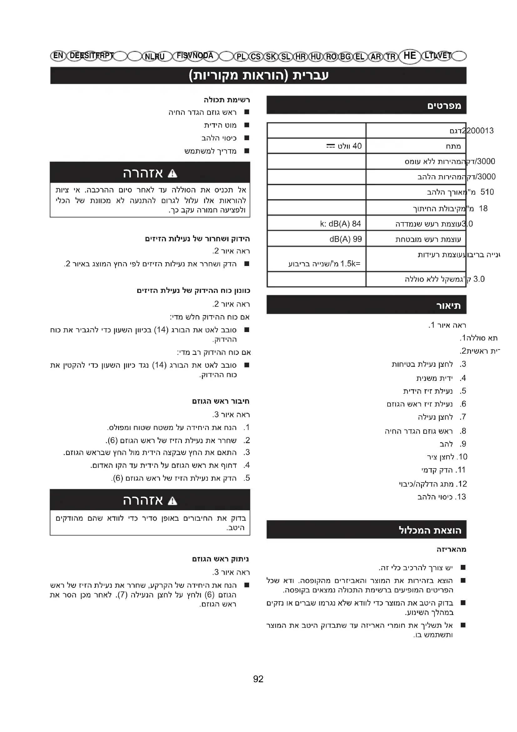 DE ES IT FR PTNL RUFI SV NO DA LT LV ET םגד2200013 טלוו 40סמוע אלל תוריהמהקד/3000בהלה תוריהמהקד/3000בהלה ךרואמ"מ 510ךותיחה תלוביקמ"מ 18הדדמנש שער תמצוע3.0 k: dB(A) 84תחטבומ שער תמצועdB(A) 99תודיער תמצועעובירב היינש/'מ 2.5<עובירב היינש/'מ 1.5k= הללוס אלל לקשמג"ק 3.0 .1 רויא האר .1הללוס את .2תישאר תידי .3תוחיטב תליענ ןצחל .4תינשמ תידי .5תידיה זיז תליענ .6םזוגה שאר זיז תליענ .7הליענ ןצחל .8היחה רדגה םזוג שאר .9בהלריצ ןצחל .10ימדק קדה .11יוביכ/הקלדה גתמ .12בהלה יוסיכ .13 לולכמה תאצוה