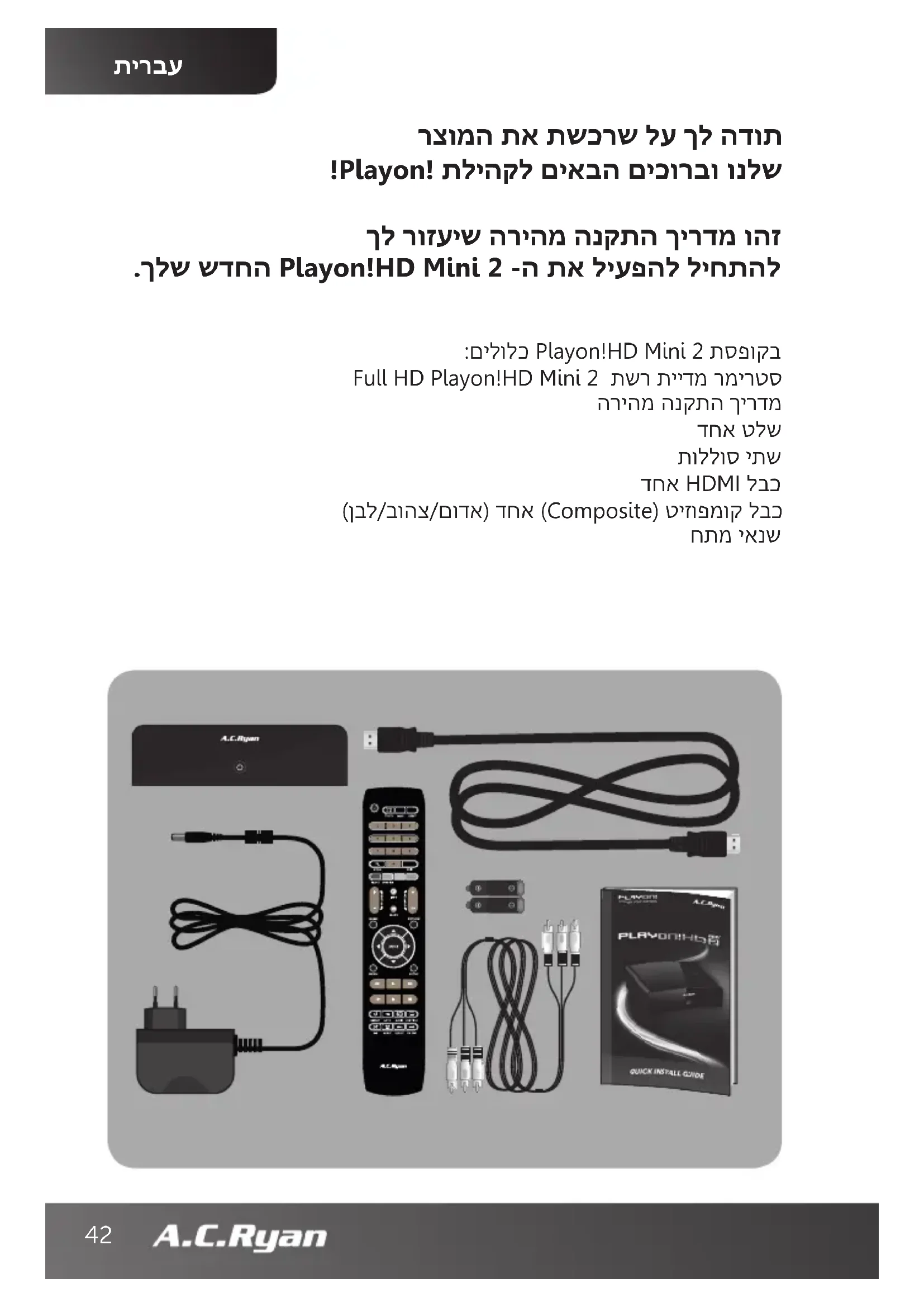 41רצומה תא תשכרש לע ךל הדות !Playon! תליהקל םיאבה םיכורבו ונלש ךל רוזעיש הריהמ הנקתה ךירדמ והז .ךלש שדחה Playon!HD Mini 2 -ה תא ליעפהל ליחתהל :םילולכ Playon!HD Mini 2 תספוקב Full HD Playon!HD Mini 2 תשר תיידמ רמירטס הריהמ הנקתה ךירדמ