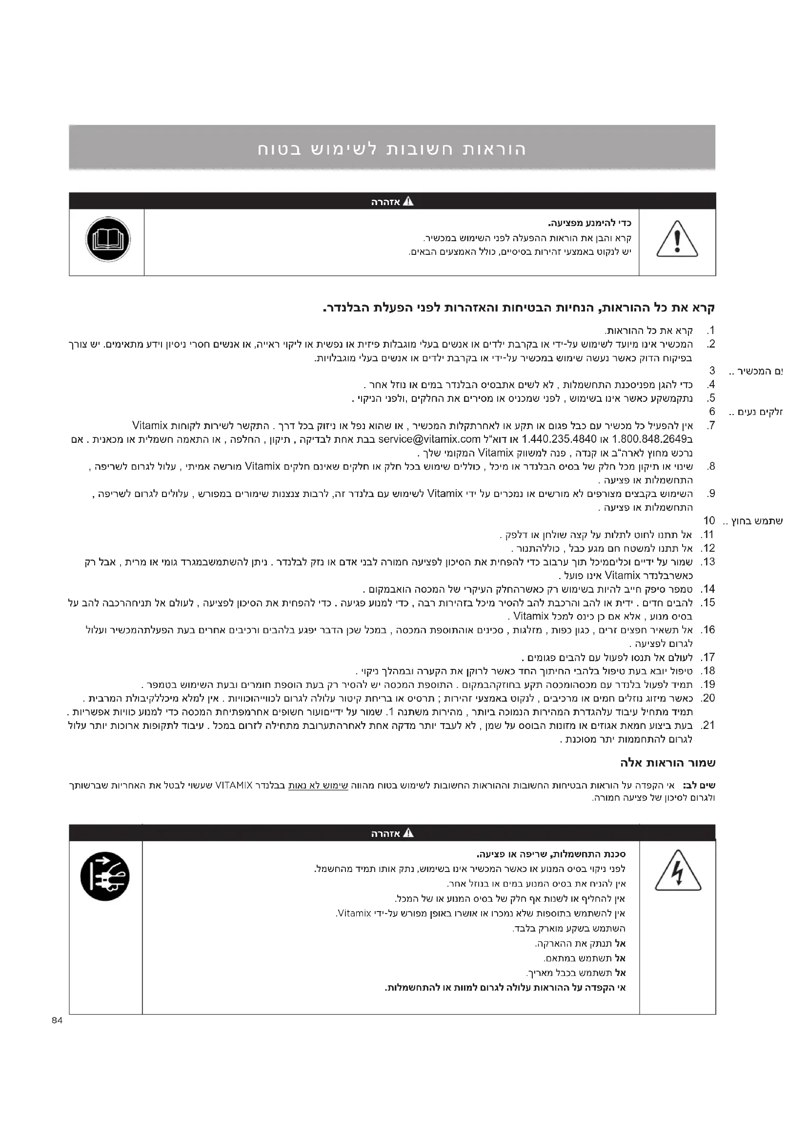 .העיצפ וא הפירש ,תולמשחתה תנכס .למשחהמ דימת ותוא קתנ ,שומישב וניא רישכמה רשאכ וא עונמה סיסב יוקינ ינפל .רחא לזונב וא םימב עונמה סיסב תא חינהל ןיא .לכמה לש וא עונמה סיסב לש קלח ףא תונשל וא ףילחהל ןיא .Vitamix ידי-לע שרופמ ןפואב ורשוא וא ורכמנ אלש תופסותב שמתשהל ןיא .דבלב קראומ עקשב שמתשה .הקראהה תא קתנת לא .םאתמב שמתשת לא.ךיראמ לבכב שמתשת לא .תולמשחתהל וא תוומל םורגל הלולע תוארוהה לע הדפקה יא חוטב שומישל תובושח תוארוה ךתושרבש תוירחאה תא לטבל יושעש VITAMIX רדנלבב תואנ אל שומיש הווהמ חוטב שומישל תובושחה תוארוההו תובושחה תוחיטבה תוארוה לע הדפקה יא :בל םיש .הרומח העיצפ לש ןוכיסל םורגלו הלא תוארוה רומש .רדנלבה תלעפה ינפל תורהזאהו תוחיטבה תויחנה ,תוארוהה לכ תא ארק 1 ..תוארוהה לכ תא ארק 2 . ךרוצ שי .םימיאתמ עדיו ןויסינ ירסח םישנא וא ,הייאר יוקיל וא תישפנ וא תיזיפ תולבגומ ילעב םישנא וא םידלי תברקב וא ידי-לע שומישל דעוימ וניא רישכמה .תויולבגומ ילעב םישנא וא םידלי תברקב וא ידי-לע רישכמב שומיש השענ רשאכ קודה חוקיפב 3 .. רישכמה םע וקחשי אל םהש אדוול ידכ םידלי לע חיגשהל ש 4 .. רחא לזונ וא םימב רדנלבה סיסבתא םישל אל , תולמשחתה תנכסינפמ ןגהל ידכ 5 .. יוקינה ינפלו, םיקלחה תא םיריסמ וא סינכמש ינפל , שומישב וניא רשאכ עקשמקתנ 6 .. םיענ םיקלח םע רשק תריצימ ענמיה 7 .Vitamix תוחוקל תורישל רשקתה . ךרד לכב קוזינ וא לפנ אוהש וא , רישכמה תולקתרחאל וא עקת וא םוגפ לבכ םע רישכמ לכ ליעפהל ןיא םא . תינאכמ וא תילמשח המאתה וא , הפלחה , ןוקית , הקידבל תחא תבב service@vitamix.com ל”אוד וא 1.440.235.4840 וא 1.800.848.2649ב . ךלש ימוקמה Vitamix קוושמל הנפ , הדנק וא ב”הראל ץוחמ שכרנ 8 . , הפירשל םורגל לולע , יתימא השרומ Vitamix םיקלח םניאש םיקלח וא קלח לכב שומיש םיללוכ , לכימ וא רדנלבה סיסב לש קלח לכמ ןוקית וא יוניש . העיצפ וא תולמשחתה 9 . , הפירשל םורגל םילולע , שרופמב םירומיש תונצנצ תוברל ,הז רדנלב םע שומישל Vitamix ידי לע םירכמנ וא םישרומ אל םיפרוצמ םיצבקב שומישה . העיצפ וא תולמשחתה 10 .. ץוחב שמתשהל ןיא 11 .. קפלד וא ןחלוש הצק לע תולתל טוחל ונתת לא 12 .. רונתהללוכ , לבכ עגמ םח חטשמל ונתת לא 13 . קר לבא , תירמ וא ימוג דרגמבשמתשהל ןתינ . רדנלבל קזנ וא םדא ינבל הרומח העיצפל ןוכיסה תא תיחפהל ידכ בוברע ךות לכימםילכו םיידי לע רומש . לעופ וניא Vitamix רדנלברשאכ 14 .. םוקמבאוה הסכמה לש ירקיעה קלחהרשאכ קר שומישב תויהל בייח קפיס רפמט 15 . לע בהל הבכרהחינת לא םלועל , העיצפל ןוכיסה תא תיחפהל ידכ . העיגפ עונמל ידכ , הבר תוריהזב לכימ ריסהל בהל תבכרהו בהל וא תידי . םידח םיבהל . Vitamix לכמל סניכ ןכ םא אלא , עונמ סיסב 16 . לולעו רישכמהתלעפה תעב םירחא םיביכרו םיבהלב עגפי רבדה ןכש לכמב , הסכמה תפסותהוא םיניכס , תוגלזמ , תופכ ןוגכ , םירז םיצפח ריאשת לא . העיצפל םורגל 17 .. םימוגפ םיבהל םע לועפל וסנת לא םלועל 18 .. יוקינ ךלהמבו הרעקה תא ןקורל רשאכ דחה ךותיחה יבהלב לופיט תעב אבוי לופיט 19 .. רפמטב שומישה תעבו םירמוח תפסוה תעב קר ריסהל שי הסכמה תפסותה . םוקמבהקזוחב עקת הסכמוהסכמ םע רדנלב לועפל דימת 20 . . תיברמה תלוביקללכימ אלמל ןיא . תויווכוהייווכל םורגל הלולע רוטיק תחירב וא סיסרת ; תוריהז יעצמאב טוקנל , םיביכרמ וא םימח םילזונ גוזימ רשאכ . תוירשפא תויווכ עונמל ידכ הסכמה תחיתפמרחא םיפושח רועוםיידי לע רומש .1 הנתשמ תוריהמ , רתויב הכומנה תוריהמה תרדגהלע דוביע ליחתמ דימת 21 . לולע רתוי תוכורא תופוקתל דוביע . לכמב םורזל הליחתמ תבורעתהרחאל תחא הקדמ רתוי דבעל אל , ןמש לע ססובה תונוזמ וא םיזוגא תאמח עוציב תעב . תנכוסמ רתי תוממחתהל םורגל