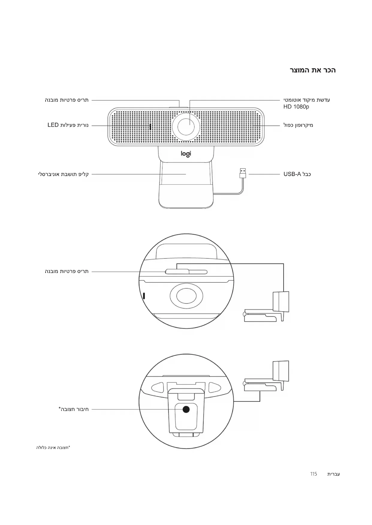 1 ףרוצמ ‘מ 1.83 ךרואב USB-A לבכ םע תשר תמלצמ 2 שמתשמל דועית הנבומה תויטרפה סירת לע הטילש 1 הריגס/החיתפל רדיילסה .בלושמ תויטרפ סירת םע עיגמ C925e שממ ,טנרטניאה תמלצמ לש ןוילעה קלחב םקוממ סירתה לש .המלצמה תשדע לעמ 2 .הלאמש רדיילסה תא זזה ,תויטרפה סירת תחיתפל 3 רדיילסה תא זזה ,השדעה תא תוסכלו תויטרפה סירת תריגסל .רוגס תויטרפה סירת רשאכ ןבלב עיפות השדעה .הנימי 116 תירבעהלולכ הניא הבוצח* תשרה תמלצמ תרדגה ךסמ לע המלצמה םוקימל 1 ךסמה וא דיינה בשחמה ,בשחמה לע תשרה תמלצמ תא םקמ .היוצר תיוז םוקימב 2 תבשותה פילק תילגר יכ אדוול תנמ לע תשרה תמלצמ תא ןנווכ .רישכמה בג םע תרשוימ ילסרבינואה 3 בוטה םוקימל הטמ/הלעמ יפלכ תשרה תמלצמ תא תינדי ןנווכ .הנומתב םקוממ התא ובש רתויב *הבוצח לע המלצמה םוקימל 1 תבשותה פילק תיתחתב ‘ץניא עברה הבוצחה רוביח תא םקמ .ילסרבינואה 2 לא המינפ הבוביס ידי לע הבוצחה לע תשרה תמלצמ תא חטבא .‘ץניא עברה רוביח 3 םוקימל הצרתש םוקמ לכב הבוצחה םע תשרה תמלצמ תא םקמ .ךמצע תא רגסמל תנמ לע יבטימ 117 תירבע:עובק תבשות פילק ללוכ :קמוע x בחור x הבוג מ“מ x 45 מ“מ x 126 מ“מ 73 ‘מ 1.83 :לבכ ךרוא ‘רג 170 :לקשמ