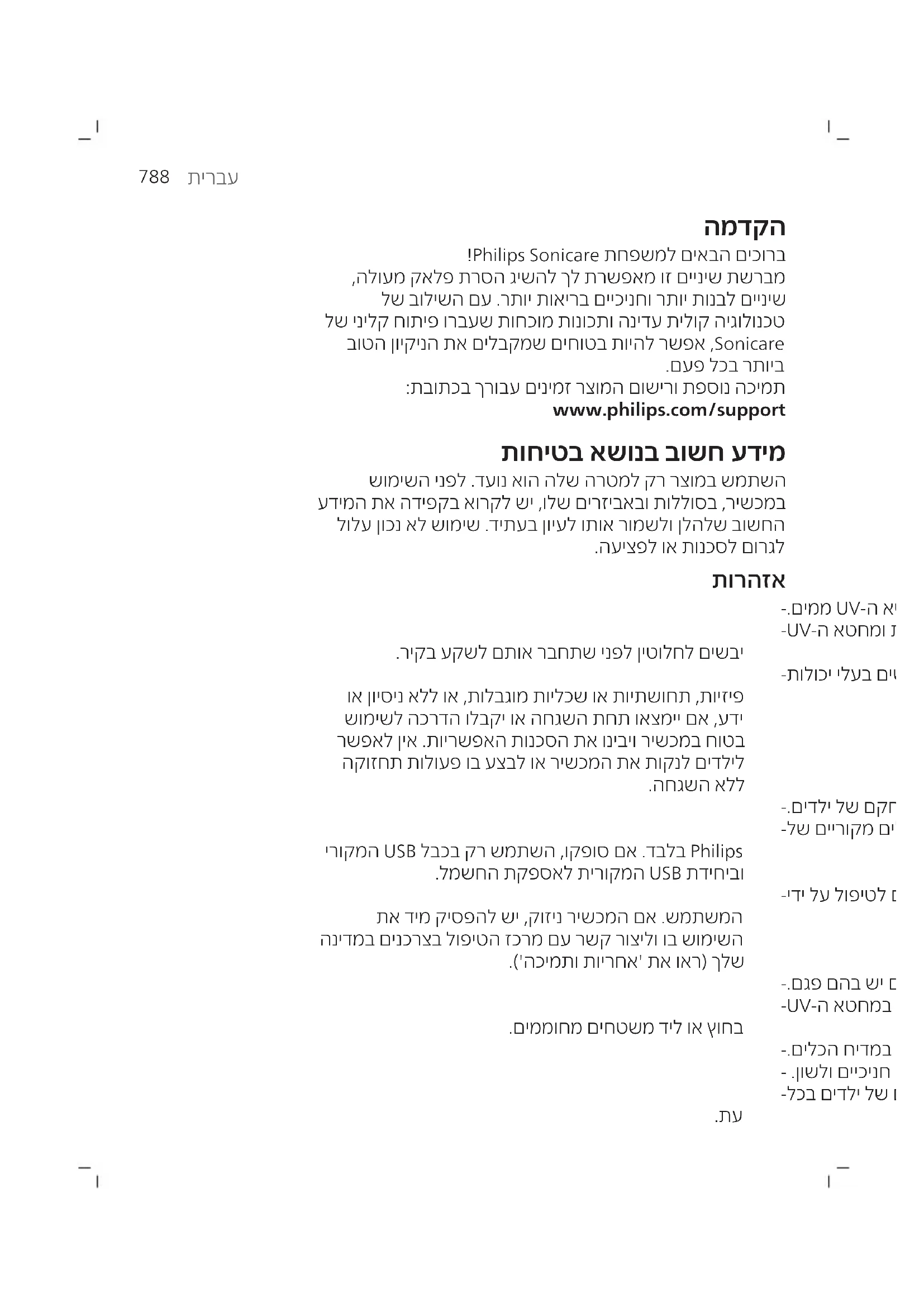 -.םידלי לש םקחשמל דעונ אל רישכמה -לש םיירוקמ םילכתמ םירצומבו םירזיבאב שמתשהל שי ירוקמה USB לבכב קר שמתשה ,וקפוס םא .דבלב Philips .למשחה תקפסאל תירוקמה USB תדיחיבו -ידי לע לופיטל םינתינה םיקלח ליכמ וניא הז רישכמ תא דימ קיספהל שי ,קוזינ רישכמה םא .שמתשמה הנידמב םינכרצב לופיטה זכרמ םע רשק רוצילו וב שומישה .('הכימתו תוירחא' תא ואר) ךלש -.םגפ םהב שי םא USB קפסב וא USB לבכב שמתשת לא -UV-ה אטחמב וא/ו תועיסנה קיתרנב ,ןעטמב שמתשת לא .םיממוחמ םיחטשמ דיל וא ץוחב -.םילכה חידמב רצומה יקלחמ דחא אל ףא תוקנל ןיא - .ןושלו םייכינח ,םייניש יוקינל קר דעוימ הז רישכמ -לכב םידלי לש םדי גשיהמ UV-ה אטחמ תא קיחרהל שי .תע789