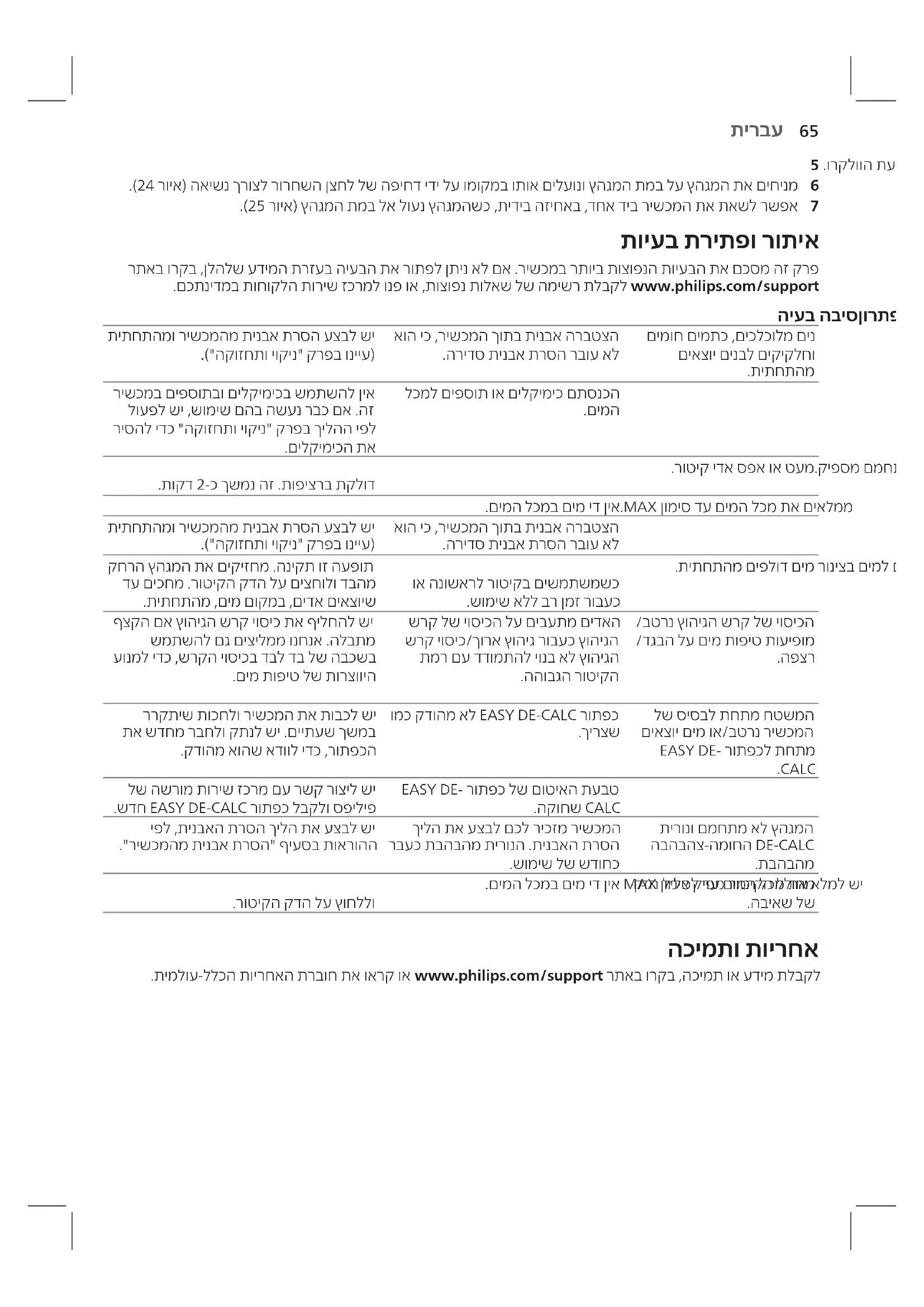 .םימה לכמב םימ יד ןיא MAX ןומיסל דע םימה לכמ תא אלמל שי .רוטיקה קדה לע ץוחללו הכימתו תוירחא .תימלוע-ללכה תוירחאה תרבוח תא וארק וא www.philips.com/support רתאב ורקב ,הכימת וא עדימ תלבקל66