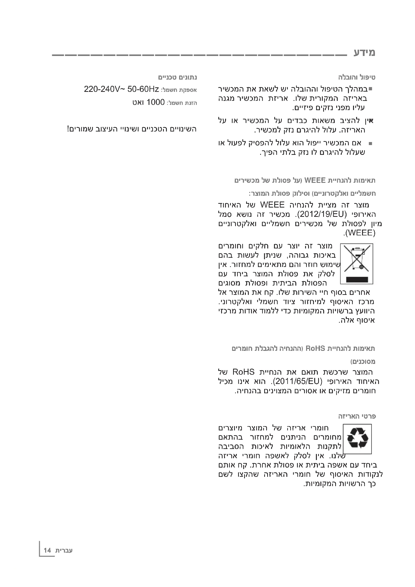 לש RoHS תייחנה תא םאות תשכרש רצומה ליכמ וניא אוה .)2011/65/EU( יפוריאה דוחיאה .היחנהב םיניוצמה םירוסא וא םיקיזמ םירמוח הזיראה יטרפ םירצוימ רצומה לש הזירא ירמוח םאתהב רוזחמל םינתינה םירמוחמ הביבסה תוכיאל תוימואלה תונקתל הזירא ירמוח הפשאל קלסל ןיא .ונלש םתוא חק .תרחא תלוספ וא תיתיב הפשא םע דחיב םשל וצקהש הזיראה ירמוח לש ףוסיאה תודוקנל .תוימוקמה תויושרה ךכ _______________________ עדימ םיינכט םינותנ 220-240V~ 50-60Hz :למשח תקפסא טאו 1000 :למשח תנזה !םירומש בוציעה ייונישו םיינכטה םייונישהתירבע 13