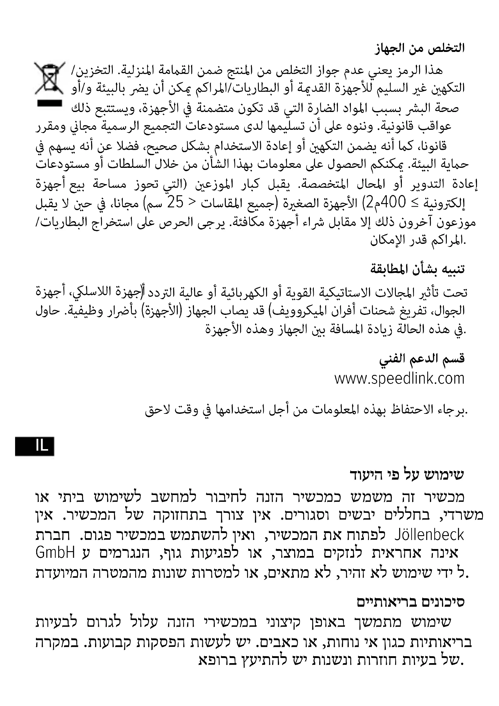 דועיה יפ לע שומיש וא יתיב שומישל בשחמל רוביחל הנזה רישכמכ שמשמ הז רישכמ ןיא .רישכמה לש הקוזחתב ךרוצ ןיא .םירוגסו םישבי םיללחב ,ידרשמ תרבח .םוגפ רישכמב שמתשהל ןיאו ,רישכמה תא חותפל Jöllenbeck GmbH ע םימרגנה ,ףוג תועיגפל וא ,רצומב םיקזנל תיארחא הניא תדעוימה הרטמהמ תונוש תורטמל וא ,םיאתמ אל ,ריהז אל שומיש ידי ל. םייתואירב םינוכיס תויעבל םורגל לולע הנזה ירישכמב ינוציק ןפואב ךשמתמ שומיש הרקמב .תועובק תוקספה תושעל שי .םיבאכ וא ,תוחונ יא ןוגכ תויתואירב אפורב ץעיתהל שי תונשנו תורזוח תויעב לש.IL