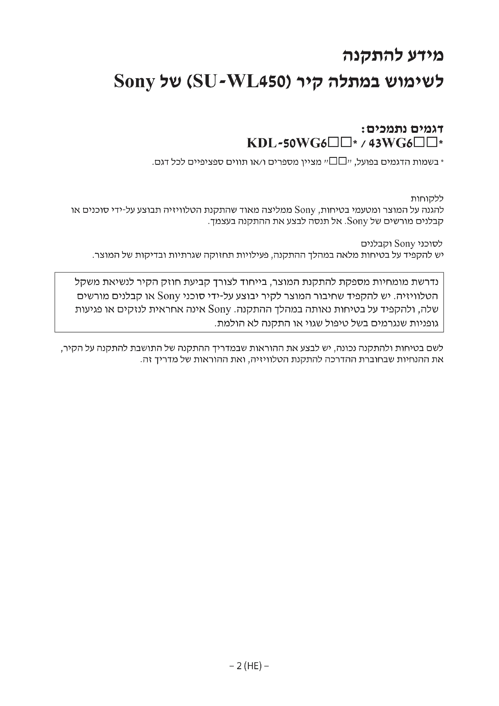 *וא*םינכוס*ידי-לע*עצובת*היזיוולטה*תנקתהש*דואמ*הצילממ*Sony*,תוחיטב*ימעטמו*רצומה*לע*הנגהל .ךמצעב*הנקתהה*תא*עצבל*הסנת*לא*.Sony*לש*םישרומ*םינלבק םינלבקו*Sony*ינכוסל .רצומה*לש*תוקידבו*תויתרגש*הקוזחת*תויוליעפ*,הנקתהה*ךלהמב*האלמ*תוחיטב*לע*דיפקהל*שי *לקשמ*תאישנל*ריקה*קזוח*תעיבק*ךרוצל*דוחייב*,רצומה*תנקתהל*תקפסמ*תויחמומ*תשרדנ *םישרומ*םינלבק*וא*Sony*ינכוס*ידי-לע*עצובי*ריקל*רצומה*רוביחש*דיפקהל*שי*.היזיוולטה *תועיגפ*וא*םיקזנל*תיארחא*הניא*Sony*.הנקתהה*ךלהמב*התואנ*תוחיטב*לע*דיפקהלו*,הלש .תמלוה*אל*הנקתה*וא*יוגש*לופיט*לשב*םימרגנש*תוינפוג *,ריקה*לע*הנקתהל*תבשותה*לש*הנקתהה*ךירדמבש*תוארוהה*תא*עצבל*שי*,הנוכנ*הנקתהלו*תוחיטב*םשל .הז*ךירדמ*לש*תוארוהה*תאו*,היזיוולטה*תנקתהל*הכרדהה*תרבוחבש*תויחנהה*תא− 3 (HE) −
