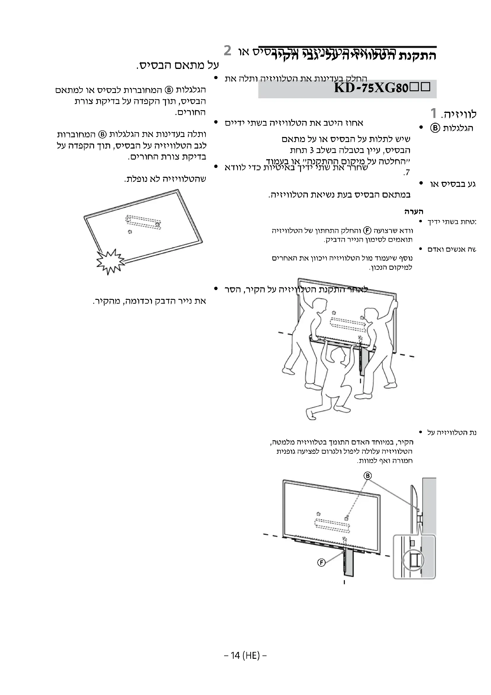 ךילא היזיוולטה תיתחת תא תולק ךושמל הסנ הנשי םא .המידק הענ אל איהש אדוול תנמ-לע קזחל שיו ,ןוכנ תבכרומ הניא איה זא ,יהשלכ העונת העוצרה תא בוש KD-65XG81/ 65XG80/ 55XG81/ 55XG80/ 49XG81/ 49XG80/ 43XG81/ 43XG80 1 .היזיוולטה תא םרה תולגלגה םוקימ תודוא םיטרפ תלבקל םאתמ לע וא סיסבה לע תולתל שיש תחת 3 בלשב הלבטב ןייע ,סיסבה דומעב וא "הנקתהה םוקימ לע הטלחה"
