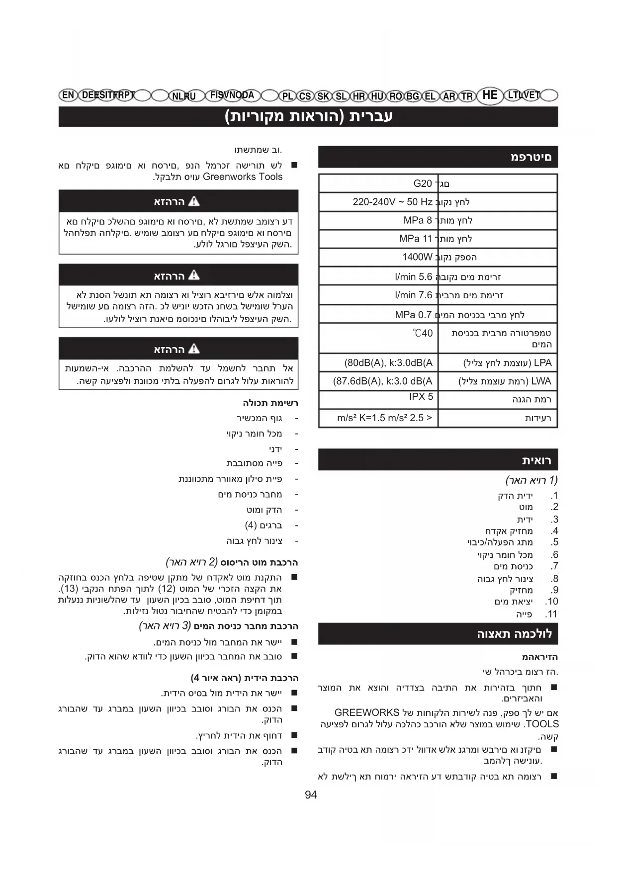 G20 - מכונת שטיפה בלחץ גבוה GREENWORKS - מדריך משתמש חינמי