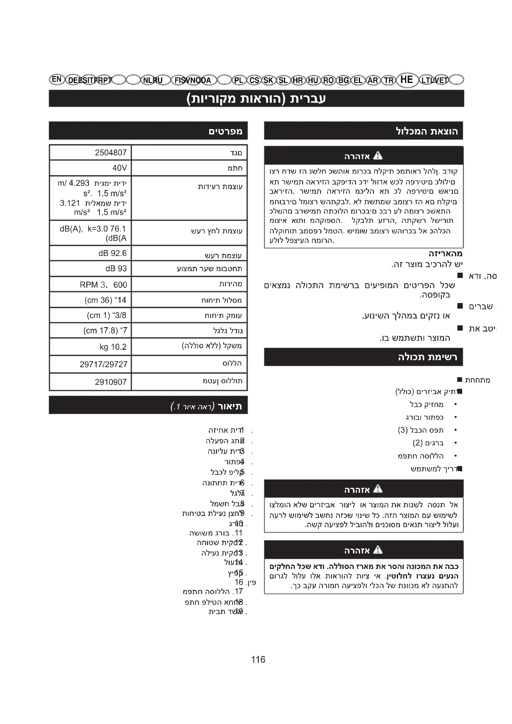 m/s² 1,5 m/s² תודיער תמצוע dB(A), k=3.0 76.1 (dB(A שער ץחל תמצוע dB 92.6