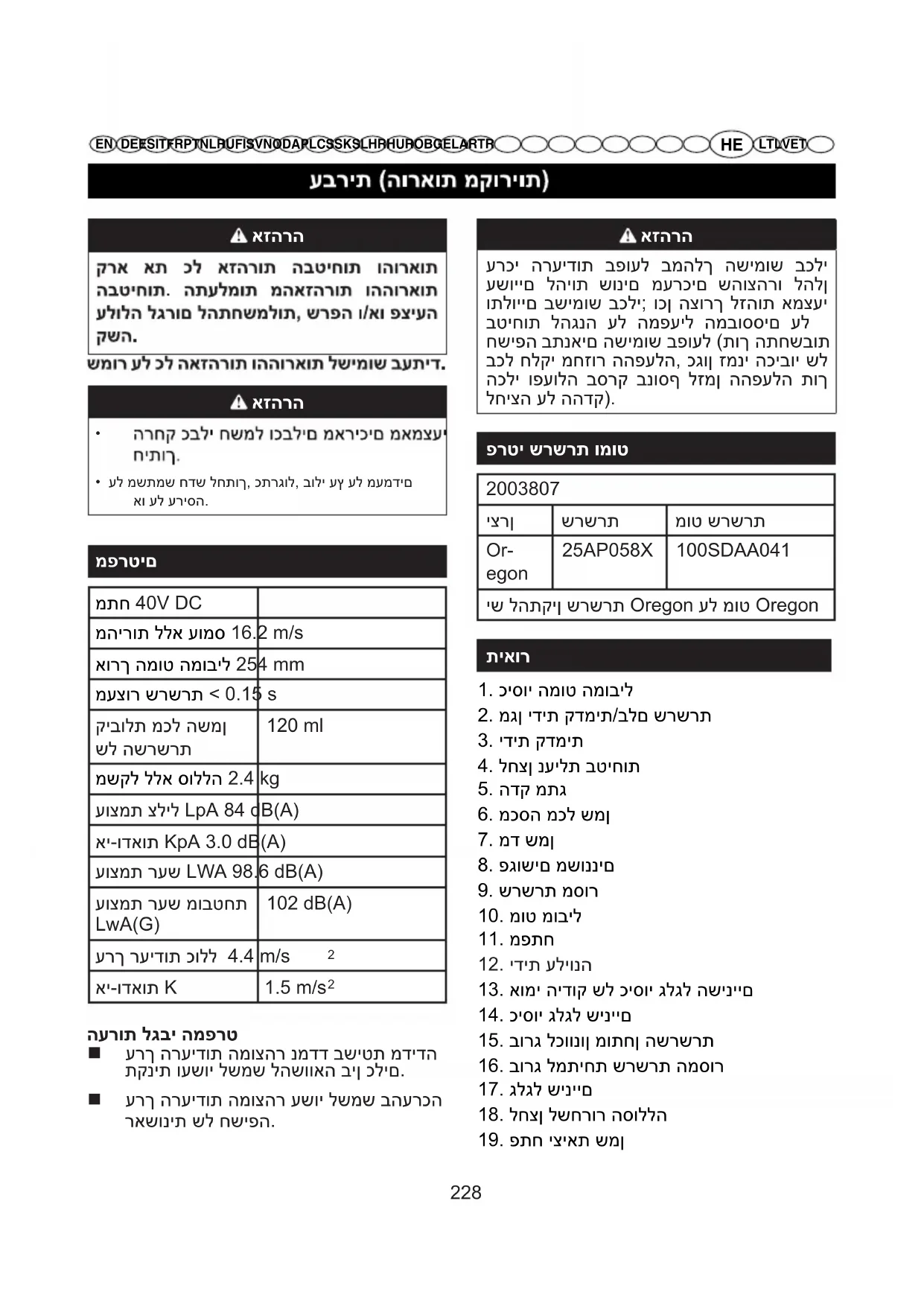 מתח 40V DC מהירות ללא עומס 16.2 m/s אורך המוט המוביל 254 mm מעצור שרשרת < 0.15 s קיבולת מכל השמן