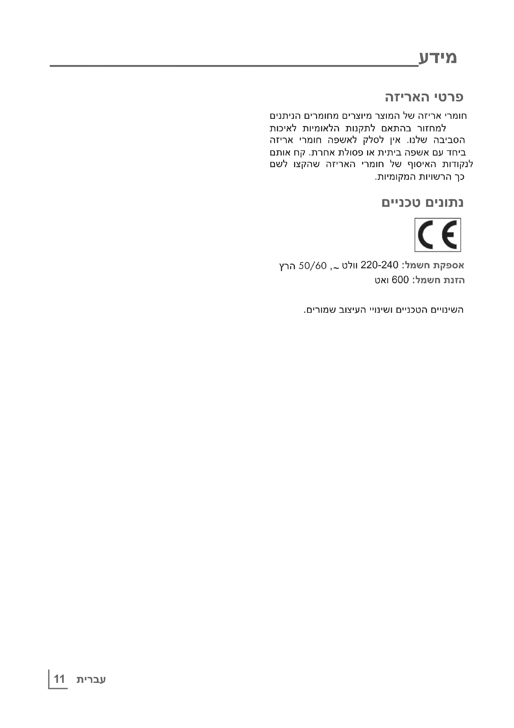 __________________________________ עדימ הזיראה יטרפ םינתינה םירמוחמ םירצוימ רצומה לש הזירא ירמוח תוכיאל תוימואלה תונקתל םאתהב רוזחמל הזירא ירמוח הפשאל קלסל ןיא .ונלש הביבסה םתוא חק .תרחא תלוספ וא תיתיב הפשא םע דחיב םשל וצקהש הזיראה ירמוח לש ףוסיאה תודוקנל .תוימוקמה תויושרה ךכ םיינכט םינותנ ץרה 50/60 ,