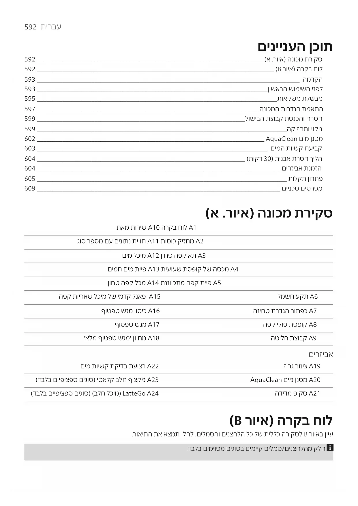 םיניינעה ןכות 592 _______________________________________________________________________(א .רויא) הנוכמ תריקס 592 __________________________________________________________________________ (B רויא) הרקב חול 593 __________________________________________________________________________________ המדקה 593 ________________________________________________________________________ןושארה שומישה ינפל 595 ___________________________________________________________________________תואקשמ תלשבמ 597 _____________________________________________________________________ הנוכמה תורדגה תמאתה 599 _________________________________________________________________לושיבה תצובק תסנכהו הרסה 599 ______________________________________________________________________________הקוזחתו יוקינ 602 _______________________________________________________________________ AquaClean םימ ןנסמ 603 ________________________________________________________________________ םימה תוישק תעיבק 604 _________________________________________________________________ (תוקד 30) תינבא תרסה ךילה 604 ____________________________________________________________________________ םירזיבא תנמזה 605 ______________________________________________________________________________ תולקת ןורתפ 609 ____________________________________________________________________________ םיינכט םיטרפמ (א .רויא) הנוכמ תריקס תאמ תוריש A10 הרקב חול A1 גוס רפסמ םע םינותנ תיוות A11 תוסוכ קיזחמ A2 םימ לכימ A12 ןוחט הפק את A3 םימח םימ תייפ A13 תיעועש תספוק לש הסכמ A4 ןוחט הפק לכמ A14 תננווכתמ הפק תייפ A5 הפק תויראש לכימ לש ימדק לנאפ A15 למשח עקת A6 ףוטפט שגמ יוסיכ A16 הניחט תרדגה רותפכ A7 ףוטפט שגמ A17 הפק ילופ תספוק A8 'אלמ ףוטפט שגמ' ןווחמ A18 הטילח תצובק A9