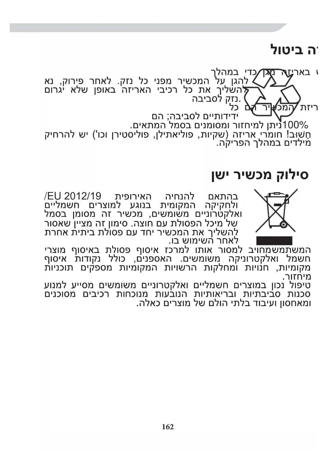 161לוטיב הזיראה ךלהמב ידכ ןגמ הזיראב שומיש השענ ,הלבוהה אנ ,קוריפ רחאל .קזנ לכ ינפמ רישכמה לע ןגהל םורגי אלש ןפואב הזיראה יביכר לכ תא ךילשהל הביבסל קזנ. לכ םה רישכמה תזיראל םישמשמה םירמוחה םה ;הביבסל םייתודידי 100% םיאתמה למסב םינמוסמו רוזחימל ןתינ. ב ָחתויקש( הזירא ירמוח ! קיחרהל שי )'וכו ןריטסילופ ,ןליתאילופ , הקירפה ךלהמב םידלימ. קוליס ןשי רישכמ םאתהב תיפוריאה היחנהל2012/19/EU םיילמשח םירצומל עגונב תימוקמה הקיקחלו למסב ןמוסמ הז רישכמ ,םישמושמ םיינורטקלאו רוסאש ןייצמ הז ןומיס .הצוח םע תלוספה לכימ לש ךילשהל תרחא תיתיב תלוספ םע דחי רישכמה תא וב שומישה רחאל. שמתשמה ירצומ ףוסיאב תלוספ ףוסיא זכרמל ותוא רוסמל ביוחמ ףוסיא תודוקנ ללוכ ,םינפסאה .םישמושמ הקינורטקלאו למשח תוינכות םיקפסמ תוימוקמה תויושרה תוקלחמו תויונח ,תוימוקמ