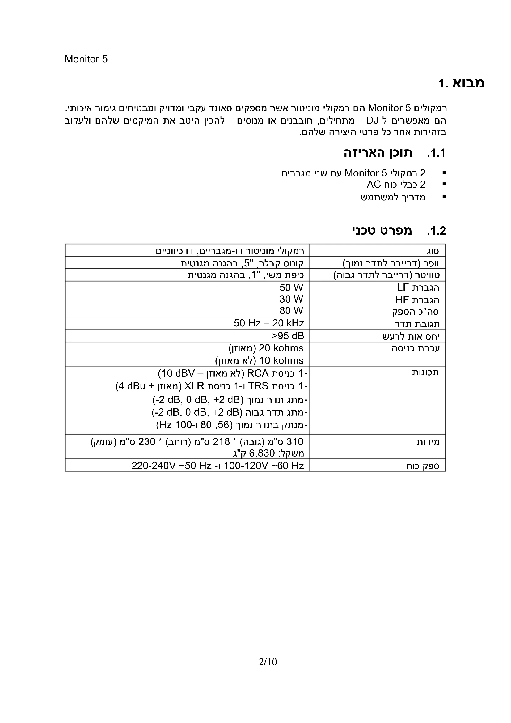 םילוקמרMonitor 5 .יתוכיא רומיג םיחיטבמו קיודמו יבקע דנואס םיקפסמ רשא רוטינומ ילוקמר םה ל םירשפאמ םה-DJ - םיסונמ וא םינבבוח ,םיליחתמ- בוקעלו םהלש םיסקימה תא בטיה ןיכהל .םהלש הריציה יטרפ לכ רחא תוריהזב 1.1. 4Bהזיראה ןכות 2 ילוקמרMonitor 5 םירבגמ ינש םע 2 חוכ ילבכAC ךירדמשמתשמל 1.2. 5Bינכט טרפמ