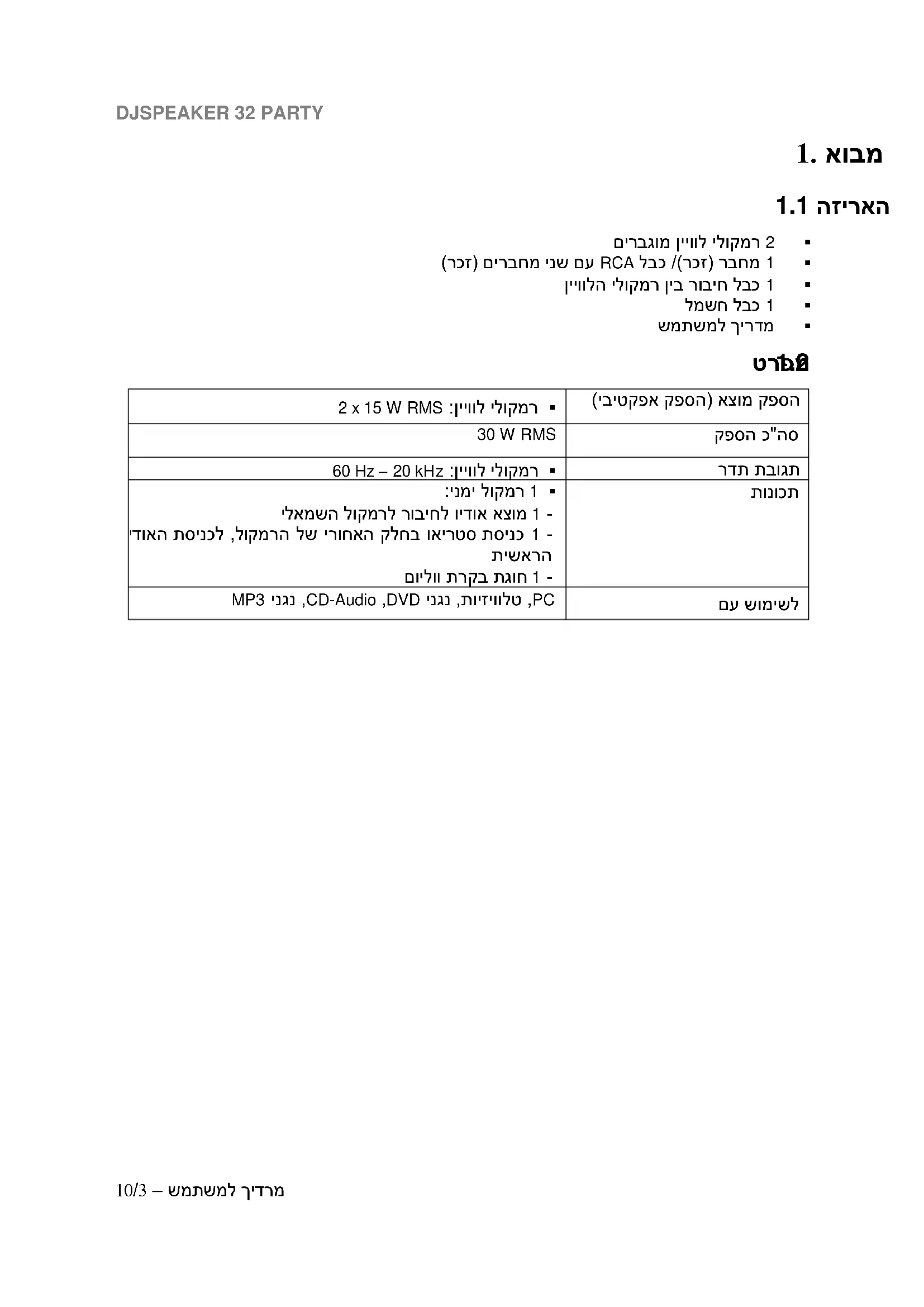 PC ,תויזיוולט , ינגנDVD ,CD-Audio ינגנ ,MP3DJSPEAKER 32 PARTY 4/10 - שמתשמל ךירדמ
