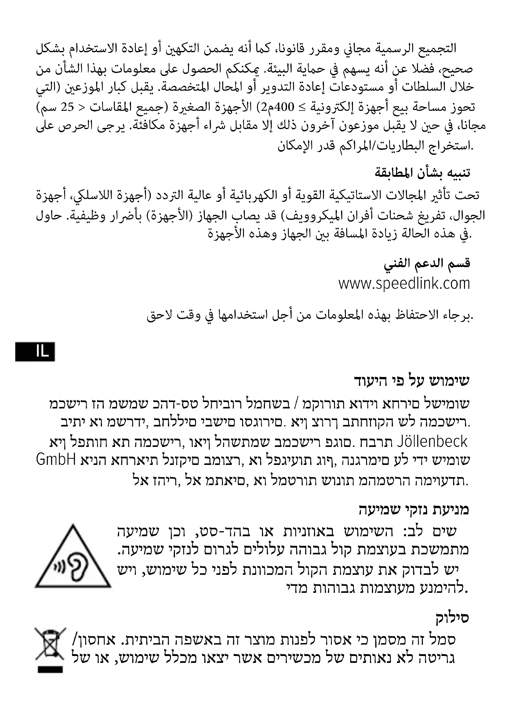תואירב יקזנל וא/ו יתביבס קזנל םורגל םייושע ,םירבצמ/תוללוס יושע רבדהו ,םיליכמ םהש םיקיזמה םירמוחהמ האצותכ תואירב ףוסיא תדוקנב הריסמה .קוח יפ לע השינע ידעצל ליבוהל ףא ףא איה .קוח יפ לע תבייחתמו ,םולשת אלל תעצבתמ תימשר .הביבסה תנגהל תמרותו ,יתוחיטב רוזחימ/לוצינ וא יוניפ החיטבמ .תומיאתמ תויונח וא ,ףוסיאה תודוקנ ,תויושרמ לבקל ןתינ עדימ ) ר“מ 400 ≥ למשח ירישכמ תריכמל חטש ילעב( תולודג תויונח ,םולשת אלל )מ“ס 25 דע דמימ לכ( םינטק םירישכמ םילבקמ ריסהל שי .ךרע יווש םירצומ תשיכר תרומת קר תורחא תויונח רשפא םא ,תונעטנ תוללוס / תוללוס. תומיאת תרעה םירדת וא ,םיילמשח ,םייטטס תודש לש תיתועמשמ העפשה הלולע )ורקימ ילג קוריפ ,םידיינ םינופלט ,רשק תוכרעמ( םיהובג שי הז הרקמב .)םירישכמה( רישכמה דוקפתב םישובישל םורגל םיעירפמה םירישכמהמ קחרמה תא לידגהל תוסנל. תינכט הכימת www.speedlink.com ידיתע שומישל הז עדימ רומש אנא.