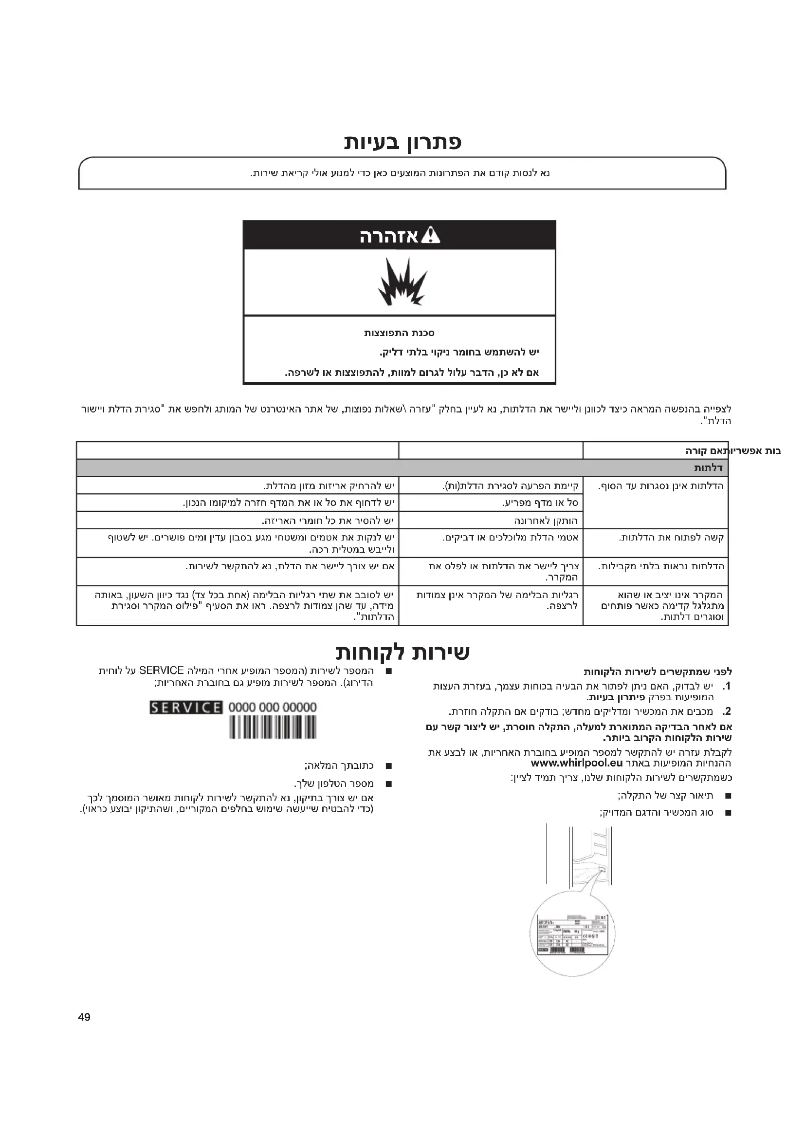 תוחוקל תוריש תוחוקלה תורישל םירשקתמש ינפל 1 . תוצעה תרזעב ,ךמצע תוחוכב היעבה תא רותפל ןתינ םאה ,קודבל שי .תויעב ןורתיפ קרפב תועיפומה 2 ..תרזוח הלקתה םא םיקדוב ;שדחמ םיקילדמו רישכמה תא םיבכמ םע רשק רוציל שי ,תרסוח הלקתה ,הלעמל תראותמה הקידבה רחאל םא .רתויב בורקה תוחוקלה תוריש תא עצבל וא ,תוירחאה תרבוחב עיפומה רפסמל רשקתהל שי הרזע תלבקל www.whirlpool.eu רתאב תועיפומה תויחנהה :ןייצל דימת ךירצ ,ונלש תוחוקלה תורישל םירשקתמשכ ■ ;הלקתה לש רצק רואית ■ ;קיודמה םגדהו רישכמה גוס ■ תיחול לע SERVICE הלימה ירחא עיפומה רפסמה( תורישל רפסמה ;תוירחאה תרבוחב םג עיפומ תורישל רפסמה .)גורידה ■ ;האלמה ךתבותכ ■ .ךלש ןופלטה רפסמ ךכל ךמסומה רשואמ תוחוקל תורישל רשקתהל אנ ,ןוקיתב ךרוצ שי םא .)יוארכ עצובי ןוקיתהשו ,םיירוקמה םיפלחב שומיש השעייש חיטבהל ידכ( .תוריש תאירק ילוא עונמל ידכ ןאכ םיעצומה תונורתפה תא םדוק תוסנל אנ