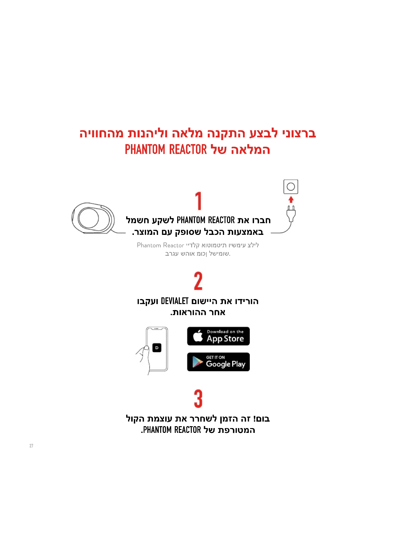 .help.devialet.com .devialet.com שמתשמל ךירדמ27 Phantom Reactor יידלק אוטומטית וישמיע צליל ברגע שהוא מוכן לשימוש. ובקעו DEVIALET םושייה תא ודירוה .תוארוהה רחא לוקה תמצוע תא ררחשל ןמזה הז !םוב .PHANTOM REACTOR לש תפרוטמה למשח עקשל PHANTOM REACTOR תא ורבח .רצומה םע קפוסש לבכה תועצמאב היווחהמ תונהילו האלמ הנקתה עצבל ינוצרב PHANTOM REACTOR לש האלמהירבע