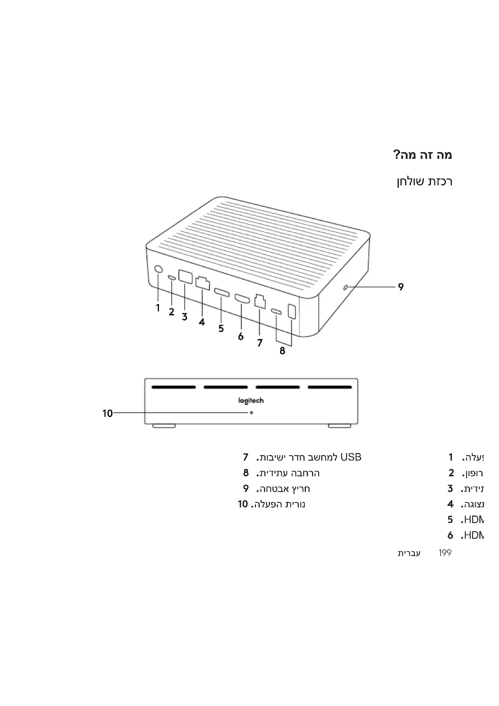 www.logitech.com/support/Rallyתירבע 199 1 .הלעפה 2 .ןופורקימ ןקתה 3 .תידיתע הבחרה 4 .הגוצת תזכרל רוביח 5 .HDMI 1 תסינכ 6 .HDMI 2 תסינכ 7 .תובישי רדח בשחמל USB 8 .תידיתע הבחרה 9 .החטבא ץירח 10 .הלעפה תירונ