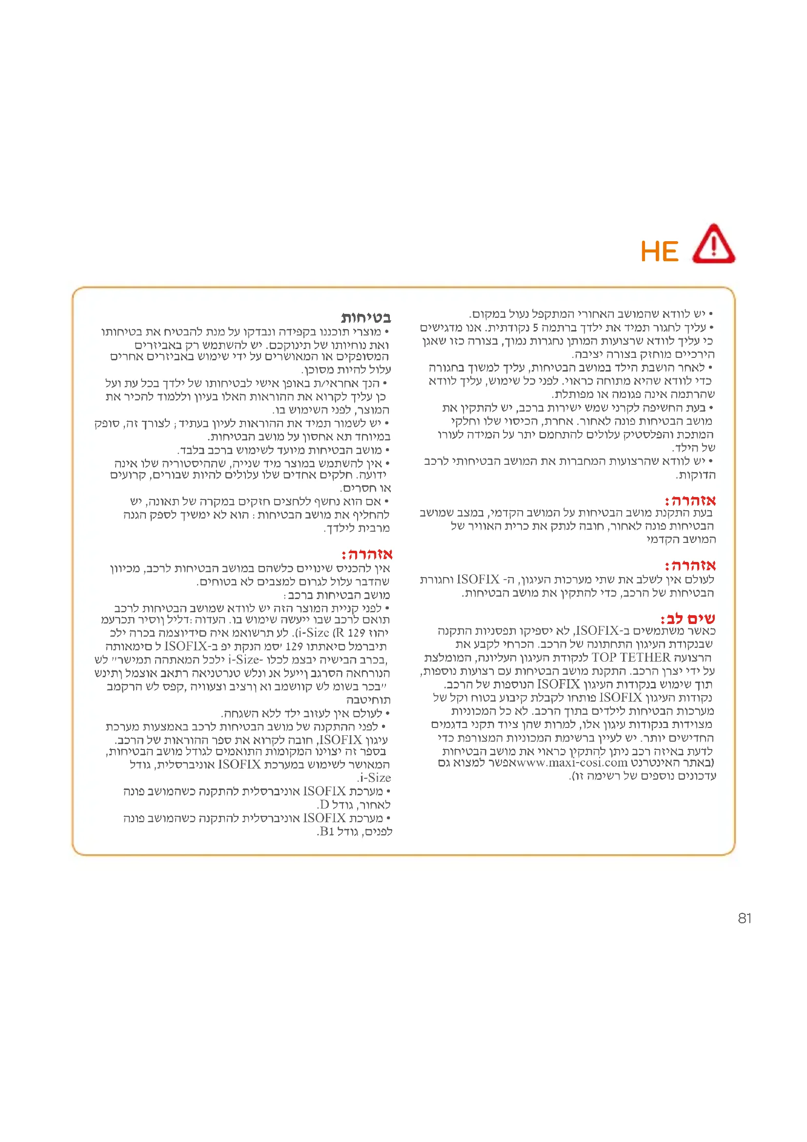 הנקתה תוינספת וקיפסי אל ,ISOFIX-ב םישמתשמ רשאכ תא עבקל יחרכה .בכרה לש הנותחתה ןוגיעה תדוקנבש תצלמומה ,הנוילעה ןוגיעה תדוקנל TOP TETHER העוצרה ,תופסונ תועוצר םע תוחיטבה בשומ תנקתה .בכרה ןרצי ידי לע .בכרה לש תופסונה ISOFIX ןוגיעה תודוקנב שומיש ךות לש לקו חוטב עוביק תלבקל וחתופ ISOFIX ןוגיעה תודוקנ תוינוכמה לכ אל .בכרה ךותב םידליל תוחיטבה תוכרעמ םימגדב ינקת דויצ ןהש תורמל ,ולא ןוגיע תודוקנב תודיוצמ ידכ תפרוצמה תוינוכמה תמישרב ןייעל שי .רתוי םישידחה תוחיטבה בשומ תא יוארכ ןיקתהל ןתינ בכר הזיאב תעדל םג אוצמל רשפאwww.maxi-cosi.com טנרטניאה רתאב( .)וז המישר לש םיפסונ םינוכדע HE82 ,רוחאל הנופ אוהשכ תוחיטבה בשומ תא םיניקתמ רשאכ • םאתהב ,בוביס עבר בבותסהל הלוכי top tether לש העוצרה .רצומה לש ןיקתה לועפתב עגפי אל הז .ןוגיעה תדוקנ םוקימל תנעשמ תא ריסהל יחרכה ,תוחיטבה בשומ תנקתה תעב • .הנוכנ הרוצב TOP TETHER-ה תא ריבעהל תנמ לע שארה ןיב םיחוורמ ונכתיי ,תוחיטבה בשומ תנקתה תעב :הרהזא • תודוקנ םוקימב הנתומ ,בכרה בשומ ןיבל תוחיטבה בשומ .בכרה ךותב ןוגיעה .הנואת רחאל תוחיטבה בשומ תא ףילחהל הבוח • ,םירחא םיצפחו ןעטמה לכש דימת דיפקהל שמתשמה לע • לש הרקמב ,תוחיטבה בשומב בשויב העיגפל םורגל םילולעש .בטיה םיחטבואמו םירושק ויהי ,תושגנתה ןוסירה ןקתה לש קיטסלפה יעטקמ תאו םיחישקה םיקלחה תא • םיליגר שומיש יאנתבש ,הזכ ןפואב ןיקתהלו םקמל שי דליל .בכרה לש תלדב וא ענ בשומל תחתמ ודכליי אל םה ,בכרב בשומ לש םירמוחה תא וא הנבמה תא תונשל ןיא םלועל • .ןרציה םע תוצעייתה אלל ,תוחיטבה תרוגח לשו תוחיטבה ףילחהל ןיא .יוסיכה אלל דליל ןוסירה ןקתהב שמתשהל ןיא • ,ןרציה ידי לע ץלמוהש הזמ רחא יוסיכב בשומה יוסיכ תא .ןוסירה ןקתה תוידוקפת לע תורישי עיפשי רבדהש ןוויכמ .שומישה תוארוהל םיתייצמ םא קר ליעי הז ןוסיר ןקתה • וניא דליה רשאכ םג ,ןוסירה ןקתה תא דימת קדהל שי • .בשומב בשוי תאזו ,ירוחאה ןעטמה ףדמ לע םידבכ םיצפח חינהל ןיא םלועל • .הנואת לש הרקמב םיפפועתמ םיצפח לש הנכסה תא עונמל ידכ המתרה לש וא תוחיטבה בשומ לש קלח ףאש דימת אדוול שי • .בכרה לש תלדב וא בכרה בשומל תחתמ ודכליי אל .םמוקמב דימת םילוענ תויהל םיבייח םילפוקמ םיבשומ • ןוכנה שומישה וא הנוכנה הנקתהל רשאב קפס ררועתי םא • תכרעמ לש ןרציל וא ץיפמל הנפי שמתשמהש ץלמומ ,תכרעמב .דליל ןוסירה