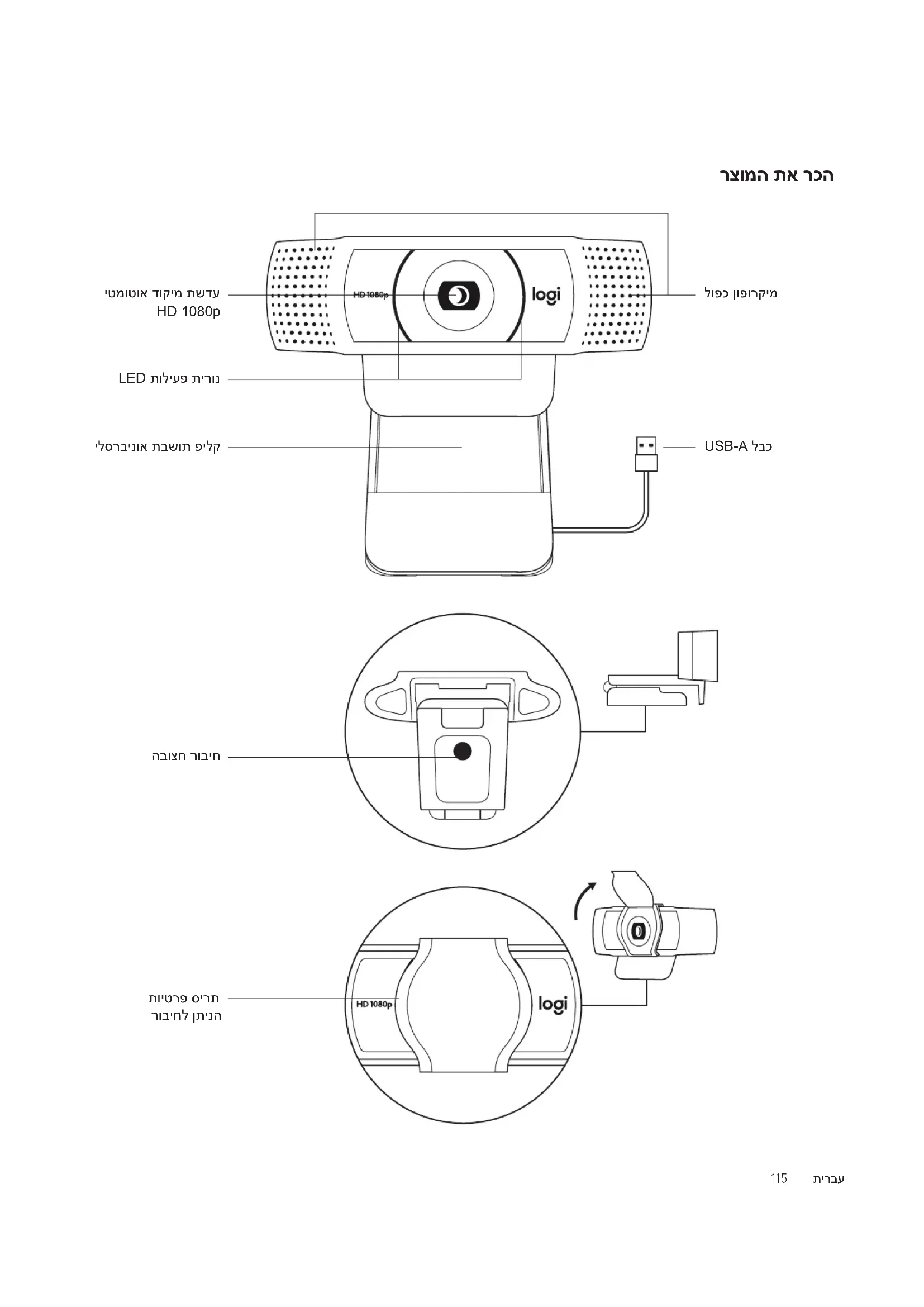 www.logitech.com/support/C920e LogitechLogiLogitech2020 LogitechLogitech Europe S.A. יטמוטוא דוקימ תשדע HD 1080p LED תוליעפ תירונ ילסרבינוא תבשות פילק הבוצח רוביח תויטרפ סירת רוביחל ןתינה USB-A לבכ רצומה תא רכה לופכ ןופורקימ 115 תירבעתויטרפה סירת תא רבח 1 יבג לע השדעה םוקימ ידי לע ינוציח תויטרפ סירת רבח .תשרה תמלצמ