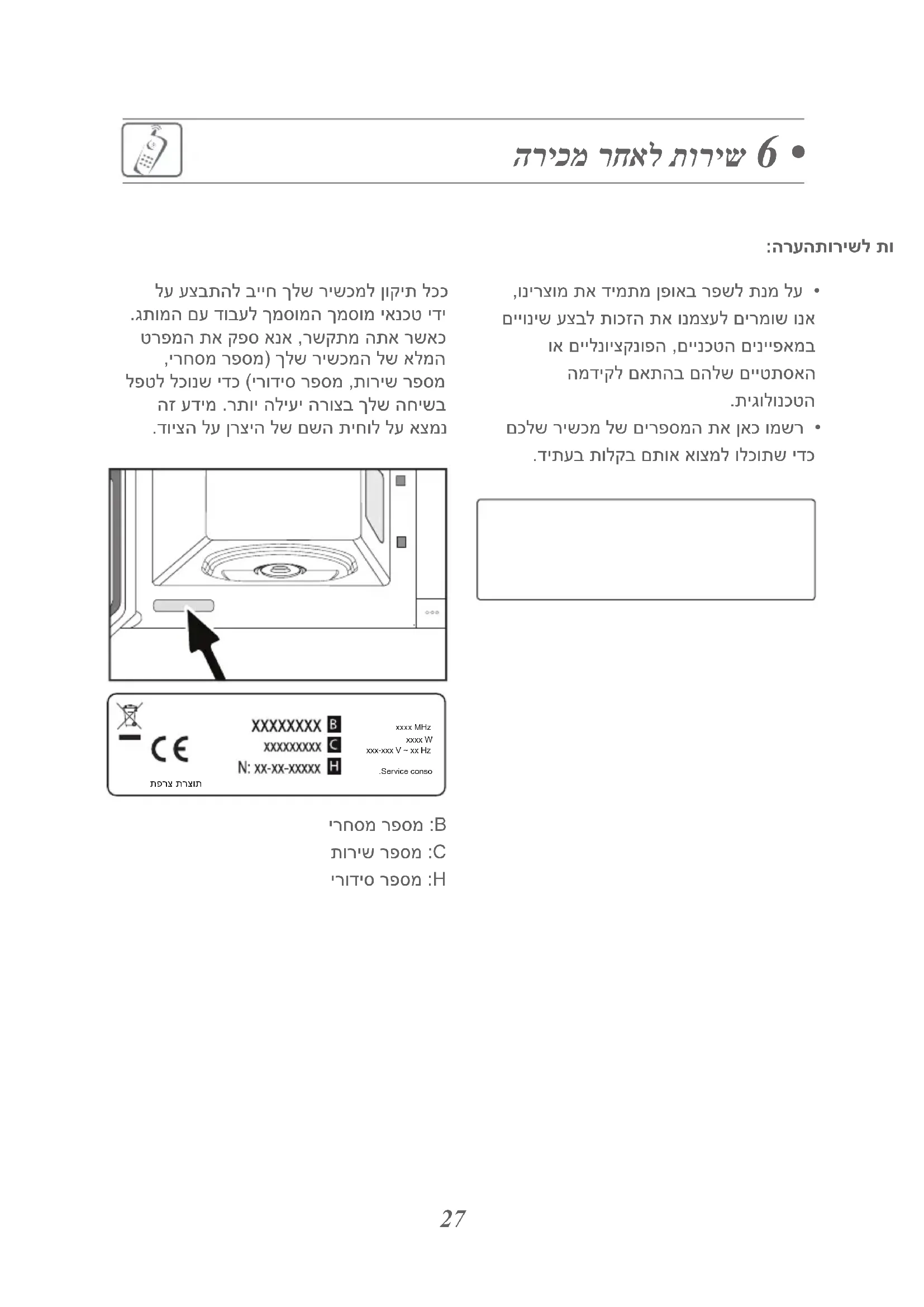 הריכמ רחאל תוריש 6 • ,ונירצומ תא דימתמ ןפואב רפשל תנמ לע • םייוניש עצבל תוכזה תא ונמצעל םירמוש ונא וא םיילנויצקנופה ,םיינכטה םינייפאמב המדיקל םאתהב םהלש םייטתסאה .תיגולונכטה םכלש רישכמ לש םירפסמה תא ןאכ ומשר • .דיתעב תולקב םתוא אוצמל ולכותש ידכ לע עצבתהל בייח ךלש רישכמל ןוקית לככ .גתומה םע דובעל ךמסומה ךמסומ יאנכט ידי טרפמה תא קפס אנא ,רשקתמ התא רשאכ ,ירחסמ רפסמ) ךלש רישכמה לש אלמה לפטל לכונש ידכ (ירודיס רפסמ ,תוריש רפסמ הז עדימ .רתוי הליעי הרוצב ךלש החישב .דויצה לע ןרציה לש םשה תיחול לע אצמנ ירחסמ רפסמ :B תוריש רפסמ :C ירודיס רפסמ :H26