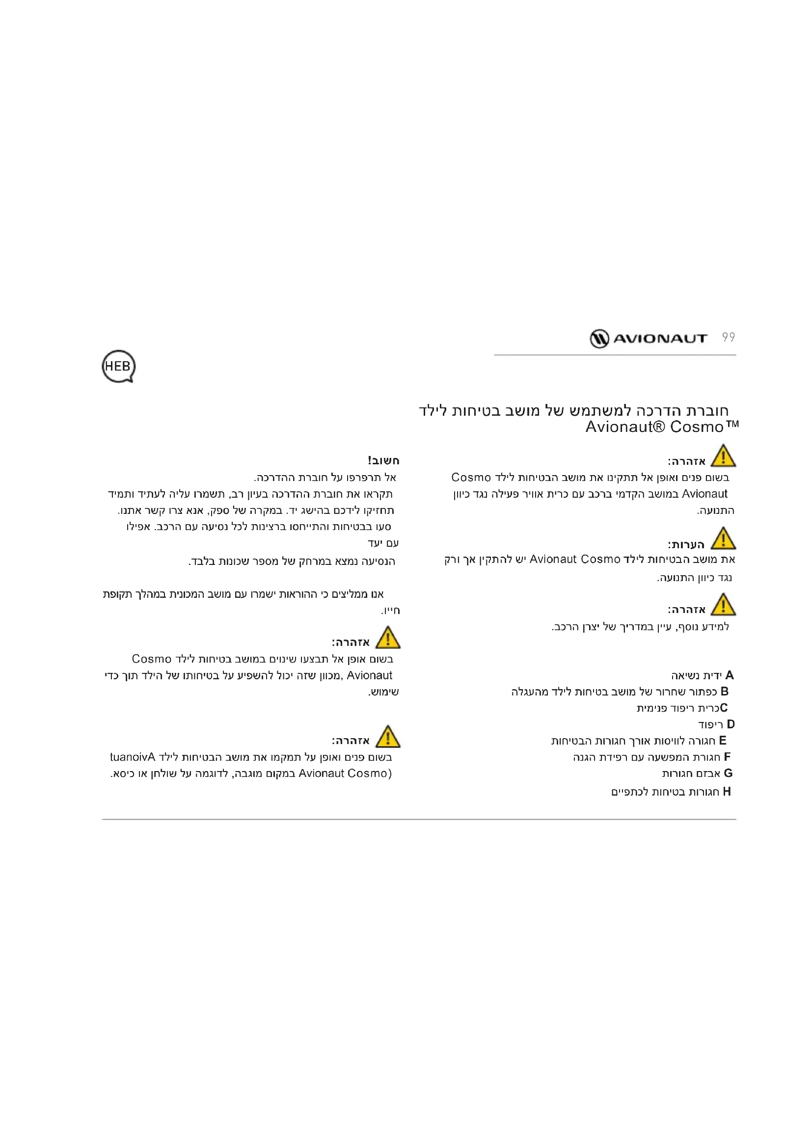 יאנתב ,םירמוח לש רוצייב יאלב יגוס לכ לע הלח תוירחאה - שמתשמל הכרדה תרבוחל םאתהב עצבתמ רצומב שומישש 24 ךות ןורחאו ינושאר שמתשמ ידי לע םיריבס םיאנתב, תוירחא ומצע לע חקול Avionaut .היינקה ךיראתמ םישדוח ןאוביה קר לבא ,יאלב םע רצומ לש הפלחה וא ןוקית לע הטלחהה תא לבקמו תוחוקלהמ תונולתה תא לבקמ השרומה .רצומב יאלב לש תויעבב לופיטה ןפוא יבגל תיפוסה שומישמ האצותכ םיעבונ םימגפו הרקמב הלח אל תוירחאה - תוכיאב הדיריו יעבט עבצ ןדבוא וא דב לש הקיחש ןוגכ ימוימוי .רצומה לש תיעבט הקיחשמ תעבונש םירמוחה הרימש יא ךות תועטב םרגנ םגפהו הרקמב הלח אל תוירחאה - אל שומיש ,שמתשמל הכרדהה תרבוחב םימושרה םיללכה לע 102םילזונ םע עגמ ,הפירש ,תוריהז רסוחמ האצותכ םגפ ,ןוכנ .תורחא תוינוציח תוביסו Cosmo דליל תוחיטבה בשומ ,הנולתה תשגה םויל ןוכנ - .יוהיז רפסמ וא תויוותה לכ לעב תויהל בייח בכרב Avionaut .תוחוקלל תורש קפסל לוכי הרבחה םעטמ הנוממ גיצנ קר ?הנולת חולשל ךנוצרב חולשל ךנוצרבו יאלב תאצמ םא ?הנולת חולשל ךנוצרב - Cosmo ה תא תינק ולצאש רכומל הנפ אנא ,הנולת תמאמש ,ךמסמ גיצהל ךירצ הנולת שיגהל ידכ Avionaut 42 דע עצבתהל הרומא התייהש ,היינקה תא תיתדבוע .הנולתה תלבק ינפל םישדוח שי ,תוחוקל תורש זכרמל רצומה לש חולשמב ךרוצ שי םא - תויהל םיבייח דבב דב .רכומ וא ץיפמל רצומה תא ריזחהל ברעה םדקומ םוכיס אללש ןוויכ הלבוהה תולעו ןפוא םימכסומ םימגפ לש םירקמה לכ .הלבוהה תולע תא תוסכל ברסל לולע רובעב םילפוטמ תויהל םילוכי םהילע הלח אל תוירחאהש .םכסומ םולשת ברועמ היה אוהו הדימב שדחל דליל תוחיטב בשומ תא ופילחה - הרטשממ ךמסמ לבקל וכרטצת ךכ םשל .םיכרד תנואתב תוחיטבה בשומ הבש הנואתה םוקממ הנומת ,הנואתל עגונב ךמסמ ,וז הדבועל עגונב הרטשממ עדימ וא ןיעל הארנ דליל תוחיטבה בשומש חוטיב תרבחמ רושיא ,היינקה תא תמאמש ךכל ףסונב .תוירחא תדועת, חוטיב ימולשתב לולכ וניא דליל ברועמ היהש דליל תוחיטבה בשומ תא ונילא חולשל וכרטצת .םיכרד תנואתב ןכרצה תויוכז תונתשהל םילוכיש ,םימייקה םיקוחל םאתב תויוכז שי ןכרצל - תויוכז לע העיפשמ אל ל"נה תוירחאה .הנידמל הנידממ .ףקות ירב םיימואל םיקוחל םאתהב ןכרצה המושר תינלופ הרבח ידי לע הנכוה ל"נה תוירחאה - Ł.KARWALA Company address: Szarlejka, ul. Lukaszewicza 172 42-130 Wreczyca Wielka, Polska וא םירסוח םע יוהיז ירפסמ וא תויוות םע ושכרנש םירצומ )1( עובקל ןתינ אל ןכל .םישרומ אלל םיבשחנ םהשלכ םייוניש ורבעש .הז גוסמ םירצומ הסכמ אל תוירחאו יטנטוא אוה רצומה םאה 103Važno! Nemojte čitati ove upute prebrzo. Upoznajte se s njima pažljivo, čuvajte ih za budućnost i uvijek držite pri ruci. Ako ste u nedoumici, kontaktirajte nas. Putujte sigurno i svako putovanje automobilom shvatite ozbiljno. Čak i kada je odredište udaljeno samo nekoliko blokova. Preporučujemo da se upute čuvaju s autosjedalicom tokom njegovog životnog vijeka. Upozorenje: Nemojte modificirati Avionaut Cosmo sjedalo ni na koji način, jer to može utjecati na sigurnost djeteta tijekom njegove uporabe. Upozorenje: Nikada ne stavljajte Avionaut Cosmo sjedalo na poviše- nu površinu, npr. na stol ili stolicu. Upute za uporabu sjedala Avionaut® Cosmo™ Upozorenje: Nikada nemojte montirati Avionaut Cosmo sjeda- lo usmjereno stražnjom stranom u odnosu na smjer vožnje na prednjem sjedalu suvozača s aktivnim zrač- nim jastukom. Napomena: Avionaut Cosmo sjedalo treba biti instalirano u auto- mobilu isključivo stražnjom stranom u smjeru kretan- ja automobila. Upozorenje: Za više informacija pogledajte priručnik proizvođača vozila. A Ručka za nošenje B Gumb za otpuštanje sjedala iz dječjih kolica C Umetak D Presvlake E Remen za podešavanje duljine sigurnosnih pojaseva