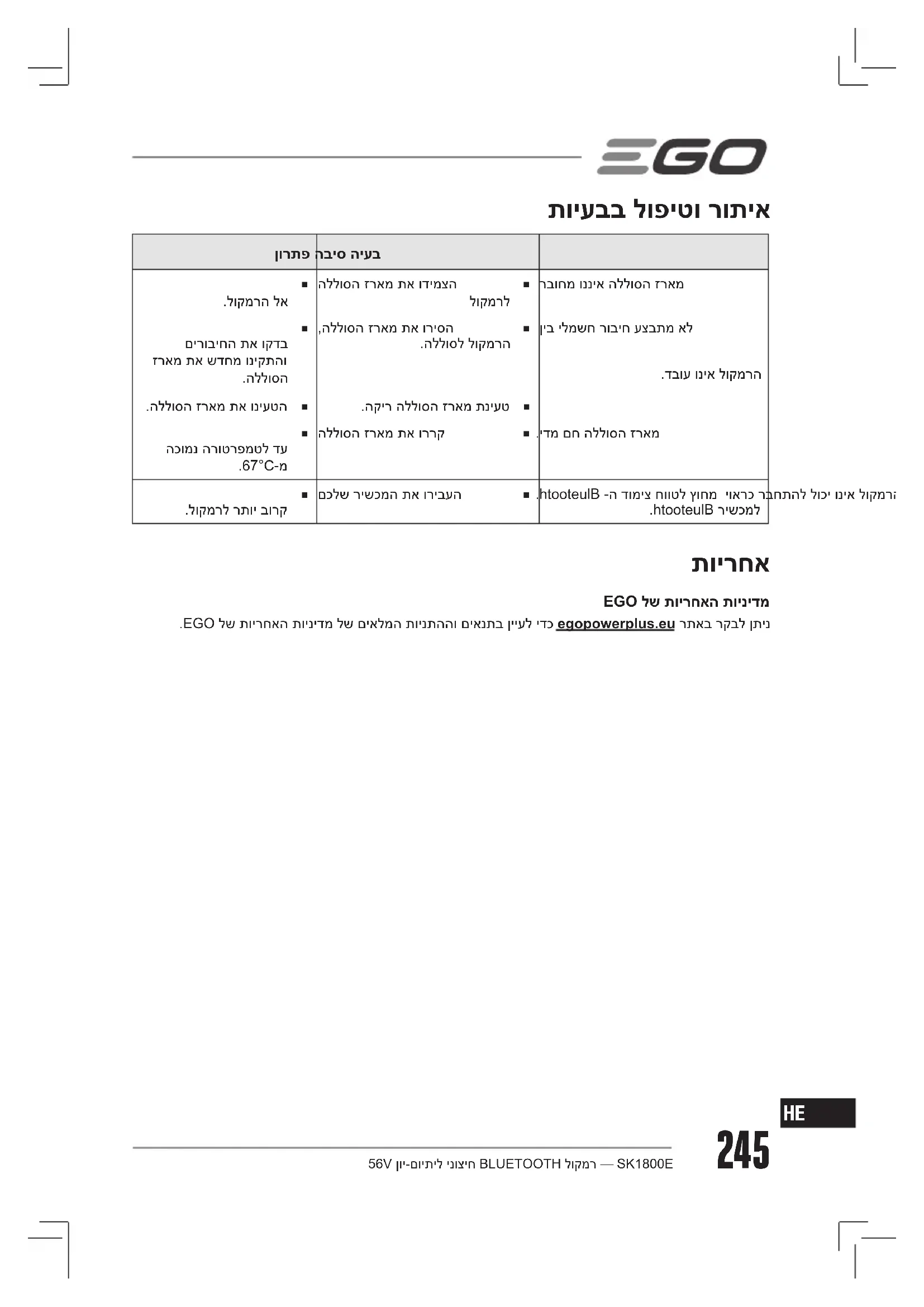EGO לש תוירחאה תוינידמ .EGO לש תוירחאה תוינידמ לש םיאלמה תוינתההו םיאנתב ןייעל ידכ egopowerplus.eu רתאב רקבל ןתינ56V ןוי-םויתיל ינוציח BLUETOOTH לוקמר — SK1800E246