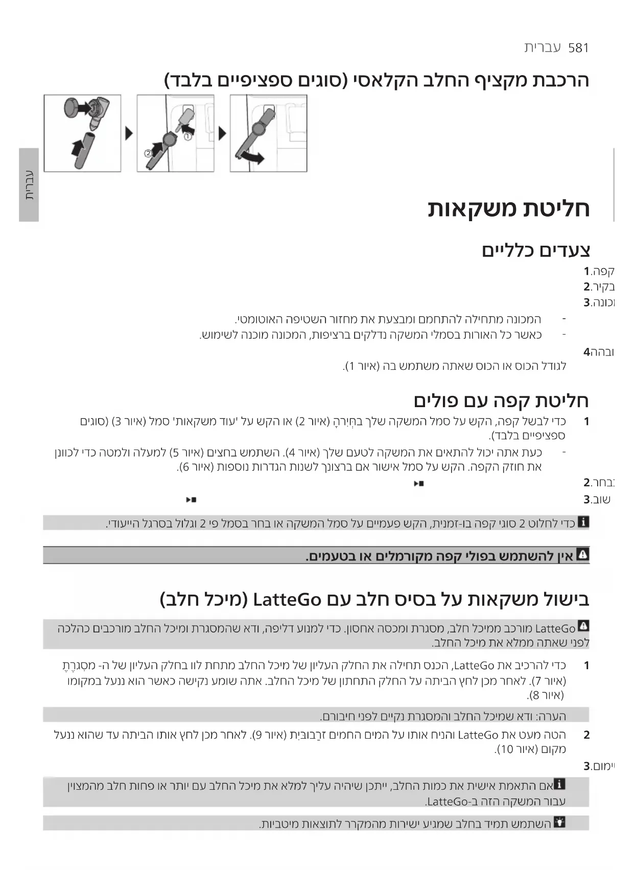 ןנווכל ידכ הטמלו הלעמל (5 רויא) םיצחב שמתשה .(4 רויא) ךלש םעטל הקשמה תא םיאתהל לוכי התא תעכ .(6 רויא) תופסונ תורדגה תונשל ךנוצרב םא רושיא למס לע שקה .הפקה קזוח תא 2.רחבנה הקשמה תא לשבל ליחתהל ידכ תע לכב הריצע/הלעפה ןצחלה לע ץחל 3.בוש הריצע/הלעפה ןצחלה לע ץחל ,הנוכמה םויס ינפל הפקה תקולח תא קיספהל ידכ .ידועייה לגרסב לולגו 2 יפ למסב רחב וא הקשמה למס לע םיימעפ שקה ,תינמז-וב הפק יגוס 2 טולחל ידכ .םימעטב וא םילמרוקמ הפק ילופב שמתשהל ןיא (בלח לכימ) LatteGo םע בלח סיסב לע תואקשמ לושיב הכלהכ םיבכרומ בלחה לכימו תרגסמהש אדו ,הפילד עונמל ידכ .ןוסחא הסכמו תרגסמ ,בלח לכיממ בכרומ LatteGo .בלחה לכימ תא אלממ התאש ינפל 1תֶרֶגסִמ -ה לש ןוילעה קלחב וול תחתמ בלחה לכימ לש ןוילעה קלחה תא הליחת סנכה ,LatteGo תא ביכרהל ידכ ומוקמב לעננ אוה רשאכ השיקנ עמוש התא .בלחה לכימ לש ןותחתה קלחה לע התיבה ץחל ןכמ רחאל .(7 רויא) .(8 רויא) .םרוביח ינפל םייקנ תרגסמהו בלחה לכימש אדו :הרעה 2לעננ אוהש דע התיבה ותוא ץחל ןכמ רחאל .(9 רויא) תיִבּוּברַז םימחה םימה לע ותוא חינהו LatteGo תא טעמ הטה .(10 רויא) םוקמ 3.םומיסקמה ףוריצל רבעמ בלחה לכימ תא אלמל ןיא .(11 רויא) בלח םע LatteGo תא אלמ ןיוצמהמ בלח תוחפ וא רתוי םע בלחה לכימ תא אלמל ךילע היהיש ןכתיי ,בלחה תומכ תא תישיא תמאתה םא .LatteGo-ב הזה הקשמה רובע .תויבטימ תואצותל ררקמהמ תורישי עיגמש בלחב דימת שמתשה582