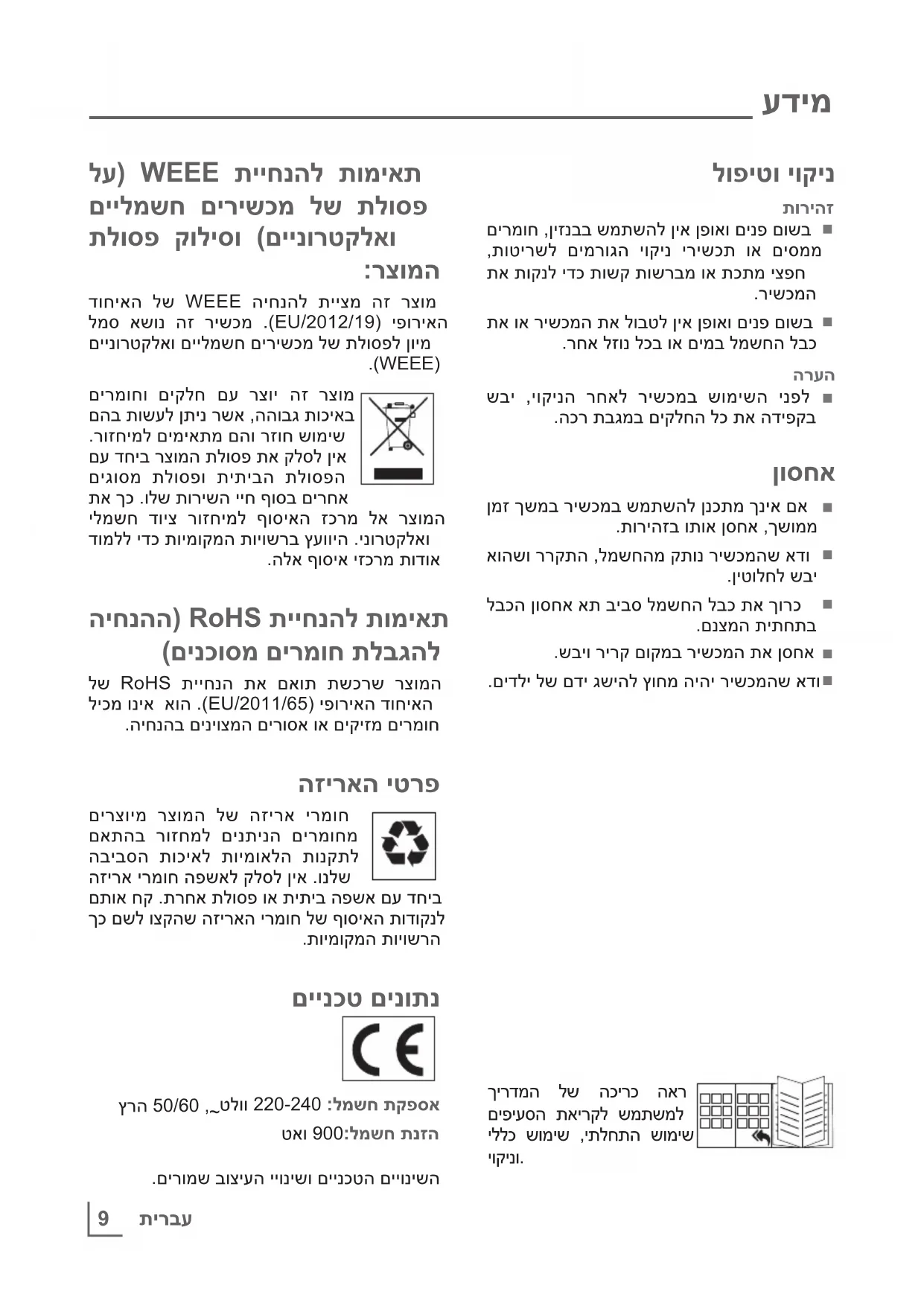 דוחיאה לש WEEE היחנהל תייצמ הז רצומ למס אשונ הז רישכמ .(EU/2012/19) יפוריאה םיינורטקלאו םיילמשח םירישכמ לש תלוספל ןוימ .(WEEE) םירמוחו םיקלח םע רצוי הז רצומ םהב תושעל ןתינ רשא ,ההובג תוכיאב .רוזחימל םימיאתמ םהו רזוח שומיש םע דחיב רצומה תלוספ תא קלסל ןיא םיגוסמ תלוספו תיתיבה תלוספה תא ךכ .ולש תורישה ייח ףוסב םירחא ילמשח דויצ רוזחימל ףוסיאה זכרמ לא רצומה דומלל ידכ תוימוקמה תויושרב ץעוויה .ינורטקלאו .הלא ףוסיא יזכרמ תודוא היחנהה( RoHS תייחנהל תומיאת )םינכוסמ םירמוח תלבגהל לש RoHS תייחנה תא םאות תשכרש רצומה ליכמ וניא אוה .(EU/2011/65) יפוריאה דוחיאה .היחנהב םיניוצמה םירוסא וא םיקיזמ םירמוח הזיראה יטרפ םירצוימ רצומה לש הזירא ירמוח םאתהב רוזחמל םינתינה םירמוחמ הביבסה תוכיאל תוימואלה תונקתל הזירא ירמוח הפשאל קלסל ןיא .ונלש םתוא חק .תרחא תלוספ וא תיתיב הפשא םע דחיב ךכ םשל וצקהש הזיראה ירמוח לש ףוסיאה תודוקנל .תוימוקמה תויושרה םיינכט םינותנ ץרה 50/60 ,