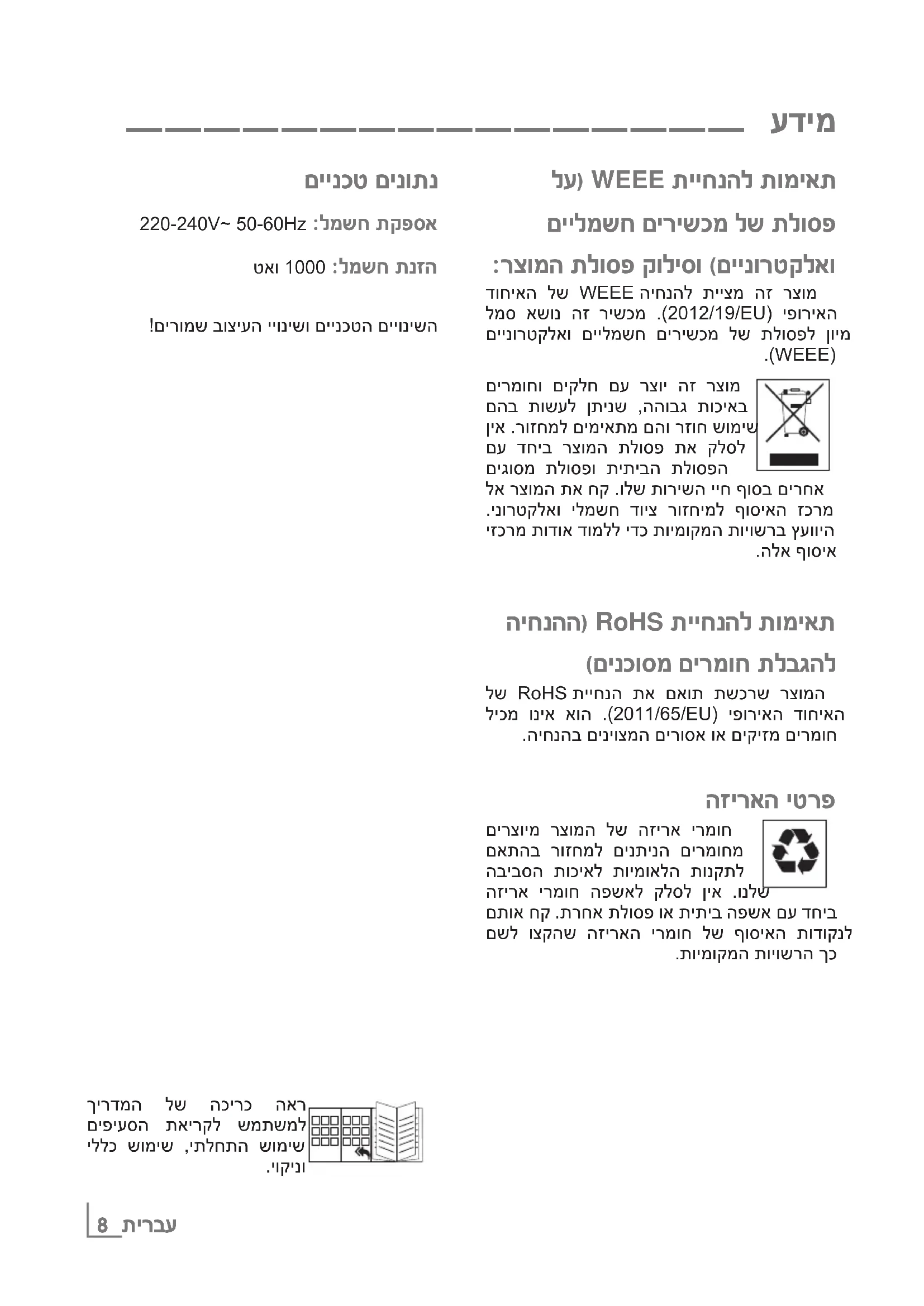 היחנהה( RoHS תייחנהל תומיאת )םינכוסמ םירמוח תלבגהל לש RoHS תייחנה תא םאות תשכרש רצומה ליכמ וניא אוה .)2011/65/EU( יפוריאה דוחיאה .היחנהב םיניוצמה םירוסא וא םיקיזמ םירמוח הזיראה יטרפ םירצוימ רצומה לש הזירא ירמוח םאתהב רוזחמל םינתינה םירמוחמ הביבסה תוכיאל תוימואלה תונקתל הזירא ירמוח הפשאל קלסל ןיא .ונלש םתוא חק .תרחא תלוספ וא תיתיב הפשא םע דחיב םשל וצקהש הזיראה ירמוח לש ףוסיאה תודוקנל .תוימוקמה תויושרה ךכ ________________ עדימ םיינכט םינותנ 220-240V~ 50-60Hz :למשח תקפסא טאו 1000 :למשח תנזה !םירומש בוציעה ייונישו םיינכטה םייונישה ךירדמה לש הכירכ האר םיפיעסה תאירקל שמתשמל יללכ שומיש ,יתלחתה שומיש .יוקינותירבע 7