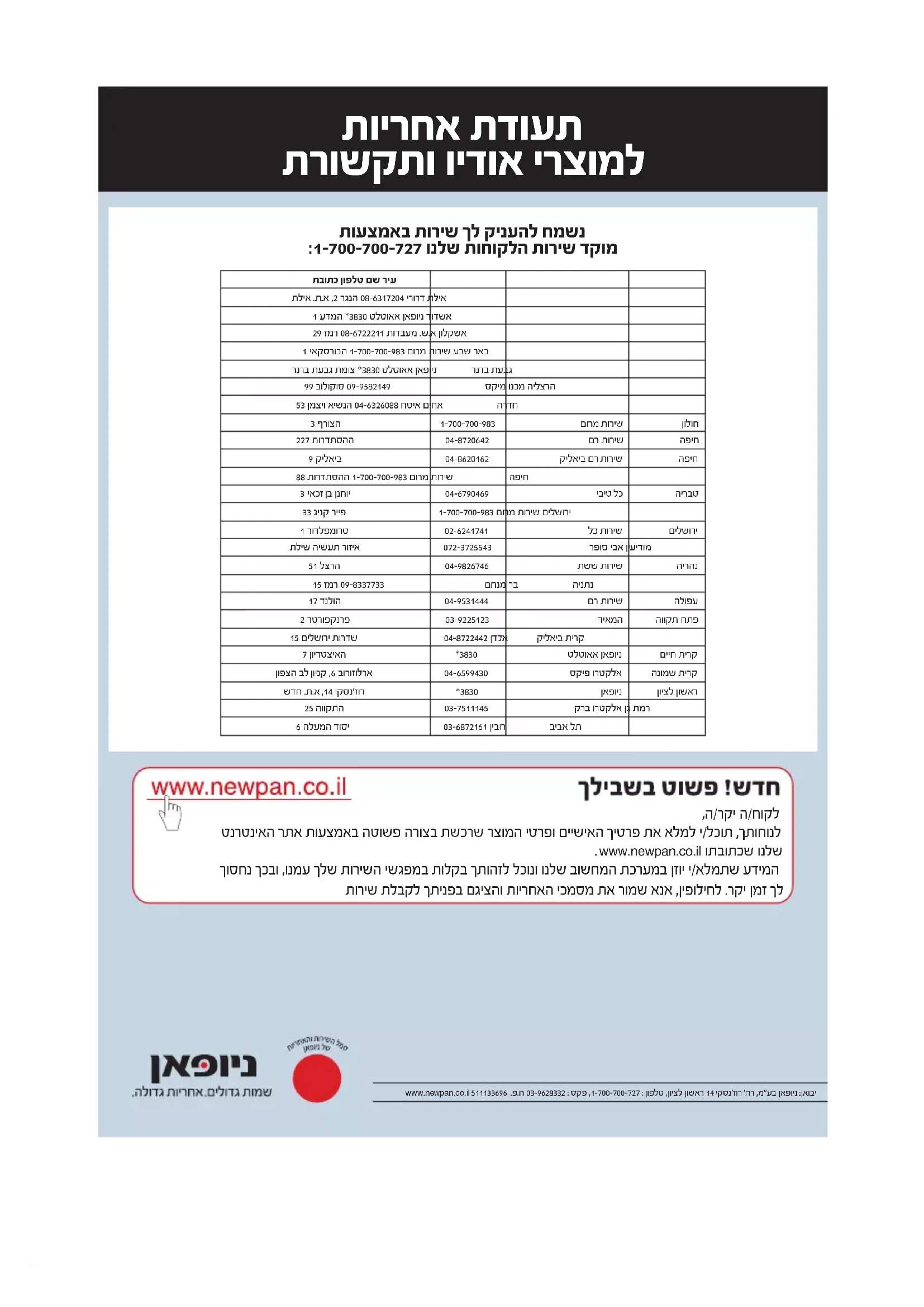 www.newpan.co.il ותבותכש ונלש ךוסחנ ךכבו ,ונמע ךלש תורישה ישגפמב תולקב ךתוהזל לכונו ונלש בושחמה תכרעמב ןזוי י/אלמתש עדימה תוריש תלבקל ךתינפב םגיצהו תוירחאה יכמסמ תא רומש אנא ,ןיפוליחל .רקי ןמז ךל תבותכ ןופלט םש ריע תליא .ת.א ,2 רגנה 08-6317204 ירורד תליא 1 עדמה *3830 טלטואא ןאפוינ דודשא 29 זמר 08-6722211 תודבעמ .ש.א ןולקשא 1 יאקסרובה 1-700-700-983 םורמ תוריש עבש ראב רנרב תעבג תמוצ *3830 טלטואא ןאפוינ רנרב תעבג 99 בולוקוס 09-9582149 סקימ ונכמ הילצרה 53 ןמציו אישנה 04-6326088 חטיא םיחא הרדח 3 ףרוצה 1-700-700-983 םורמ תוריש ןולוח 227 תורדתסהה 04-8720642 םר תוריש הפיח 9 קילאיב 04-8620162 קילאיב םר תוריש הפיח 88 תורדתסהה 1-700-700-983 םורמ תוריש הפיח 3 יאכז ןב ןנחוי 04-6790469 יביט לכ הירבט 33 גינק רייפ 1-700-700-983 םורמ תוריש םילשורי 1 רודלפמורט 02-6241741 לכ תוריש םילשורי תליש הישעת רוזיא 072-3725543 רפוס יבא ןיעידומ 51 לצרה 04-9826746 תשש תוריש הירהנ 15 זמר 09-8337733 םחנמ רב הינתנ 17 דנלוה 04-9531444 םר תוריש הלופע 2 רטרופקנרפ 03-9225123 ריאמה הווקת חתפ 15 םילשורי תורדש 04-8722442 ןדלא קילאיב תירק 7 ןוידטציאה *3830 טלטואא ןאפוינ םייח תירק ןופצה בל ןוינק ,6 בורוזולרא 04-6599430 סקיפ ורטקלא הנומש תירק שדח .ת.א ,14 יקסנ’זור *3830 ןאפוינ ןויצל ןושאר 25 הווקתה 03-7511145 קרב ורטקלא ןג תמר 6 הלעמה דוסי 03-6872161 ןיבור ביבא לתתוירחא תדועת תרושקתו וידוא ירצומל .ונב תרחבש ךל םידומו רצומה תשיכר לע ךתוא םיכרבמ ונא ,ה/רקי ה/חוקל ןאכ קבדה אנ תוירחאה תקבדמ תא :החפשמו יטרפ םש