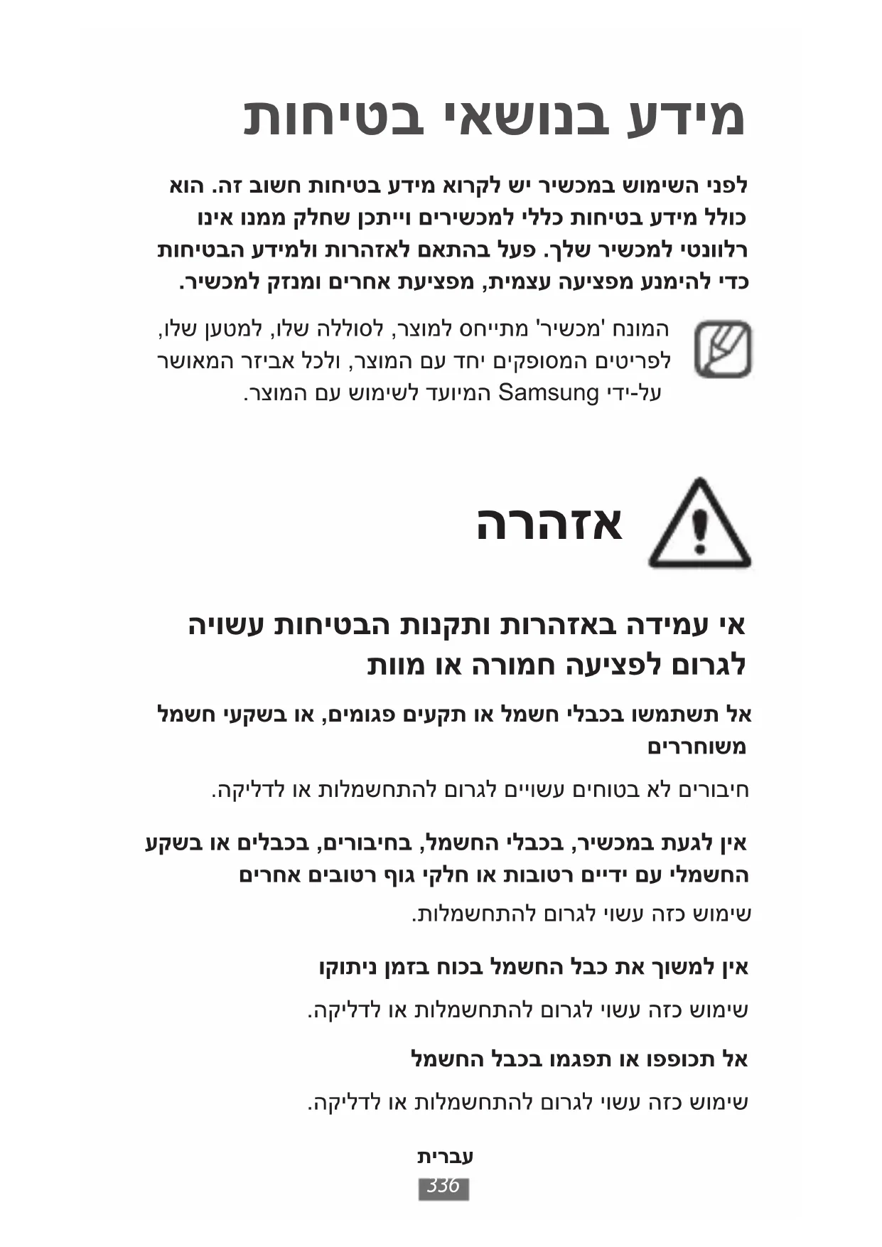 לש וייח תא רצקל יושע םינעטמ וא תויללכ תוללוסב שומיש םייושע םה ןכ ומכ .יוארכ לועפל אלש רישכמל םורגל וא רישכמה .הללוסה לש תוצצופתהל םורגל וא הפירשל םורגל Samsung ידי-לע םירשואמה ןעטמו הללוסב קרו ךא ושמתשה םייושע םימאות אל ןעטמו הללוס .םכלש רישכמל דחוימב וננכותש .רישכמל קזנל וא הרומח העיצפל םורגל תעב שמתשמה לש ותוחיטבל תיארחא הניא Samsung ידי-לע שומישל םירשואמ םניאש םיטירפ וא םירזיבאב שומיש .Samsung םיינתומה ביבס וא ירוחאה םכסיכב רישכמה תא תאשל ןיא ץחל םרגנ םא הפירשל םורגל וא ץצופתהל ,קזניהל לולע רישכמה .רישכמה לע ידמ קזח .לופית וא דעמתו הדימב עצפיהל לולע התא רישכמב קזח טובחל וא ליפהל ןיא רישכמל םורגל ,הללוסל וא רישכמל קזנ םורגל לולע רבדה .ףדמה ייח ךרוא תא רצקל וא לקלקתהל תונכסל וא הפירש ,תוחקלתה ,רתי םומיחל םורגל םג לולע רבדה .תורחאתירבע