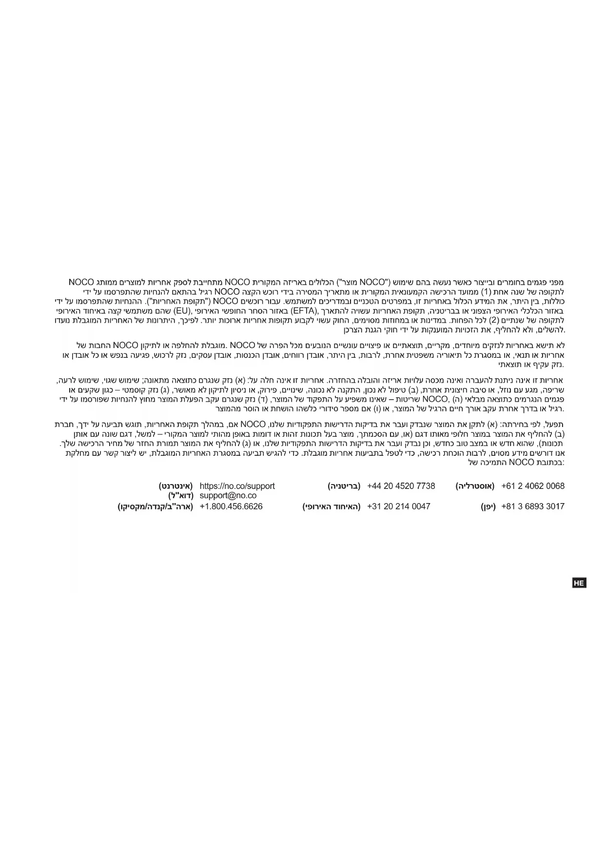 (US/CA/MX) https://no.co/support support@no.co +1.800.456.6626 (UK) (EU) (AU) (JP) +44 20 4520 7738 +31 20 214 0047 +61 2 4062 0068 +81 3 6893 3017NOCO גתוממ םירצומל תוירחא קפסל תבייחתמ NOCO תירוקמה הזיראב םילולכה ("רצומ NOCO") שומיש םהב השענ רשאכ רוצייבו םירמוחב םימגפ ינפמ ידי לע ומסרפתהש תויחנהל םאתהב ליגר NOCO הצקה שכור ידיב הריסמה ךיראתמ וא תירוקמה תיאנועמקה השיכרה דעוממ )1( תחא הנש לש הפוקתל ידי לע ומסרפתהש תויחנהה .)"תוירחאה תפוקת"( NOCO םישכור רובע .שמתשמל םיכירדמבו םיינכטה םיטרפמב ,וז תוירחאב לולכה עדימה תא ,רתיה ןיב ,תוללוכ יפוריאה דוחיאב הצק ישמתשמ םהש )EU(, יפוריאה ישפוחה רחסה רוזאב )EFTA(, ךראתהל היושע תוירחאה תפוקת ,הינטירבב וא ינופצה יפוריאה ילכלכה רוזאב ודעונ תלבגומה תוירחאה לש תונורתיה ,ךכיפל .רתוי תוכורא תוירחא תופוקת עובקל יושע קוחה ,םימיוסמ תוזוחמב וא תונידמב .תוחפה לכל )2( םייתנש לש הפוקתל ןכרצה תנגה יקוח ידי לע תוקנעומה תויוכזה תא ,ףילחהל אלו ,םילשהל. לש תובחה NOCO ןוקיתל וא הפלחהל תלבגומ. NOCO לש הרפה לכמ םיעבונה םיישנוע םייוציפ וא םייתאצות ,םיירקמ ,םידחוימ םיקזנל תוירחאב אשית אל וא ןדבוא לכ וא שפנב העיגפ ,שוכרל קזנ ,םיקסע ןדבוא ,תוסנכה ןדבוא ,םיחוור ןדבוא ,רתיה ןיב ,תוברל ,תרחא תיטפשמ הירואית לכ תרגסמב וא ,יאנת וא תוירחא יתאצות וא ףיקע קזנ. ,הערל שומיש ,יוגש שומיש ;הנואתמ האצותכ םרגנש קזנ )א( :לע הלח הניא וז תוירחא .הרזחהב הלבוהו הזירא תויולע הסכמ הניאו הרבעהל תנתינ הניא וז תוירחא וא םיעקש ןוגכ – יטמסוק קזנ )ג( ,רשואמ אל ןוקיתל ןויסינ וא ,קוריפ ,םייוניש ,הנוכנ אל הנקתה ,ןוכנ אל לופיט )ב( ,תרחא תינוציח הביס וא ,לזונ םע עגמ ,הפירש ידי לע ומסרופש תויחנהל ץוחמ רצומה תלעפה בקע םרגנש קזנ )ד( ,רצומה לש דוקפתה לע עיפשמ וניאש – תוטירש NOCO, )ה) יאלבמ האצותכ םימרגנה םימגפ רצומהמ רסוה וא תחשוה והשלכ ירודיס רפסמ םא )ו( וא ,רצומה לש ליגרה םייח ךרוא בקע תרחא ךרדב וא ליגר. תרבח ,ךדי לע העיבת שגות ,תוירחאה תפוקת ךלהמב ,םא NOCO ,ונלש תוידוקפתה תושירדה תוקידב תא רבעו קדבנש רצומה תא ןקתל )א( :התריחב יפל ,לעפת ןתוא םע הנוש םגד ,לשמל – ירוקמה רצומל יתוהמ ןפואב תומוד וא תוהז תונוכת לעב רצומ ,ךתמכסה םע ,וא( םגד ותואמ יפולח רצומב רצומה תא ףילחהל )ב( .ךלש השיכרה ריחמ לש רזחה תרומת רצומה תא ףילחהל )ג( וא ,ונלש תוידוקפתה תושירדה תוקידב תא רבעו קדבנ ןכו ,שדחכ בוט בצמב וא שדח אוהש ,)תונוכת תקלחמ םע רשק רוציל שי ,תלבגומה תוירחאה תרגסמב העיבת שיגהל ידכ .תלבגומ תוירחא תועיבתב לפטל ידכ ,השיכר תחכוה תוברל ,םיוסמ עדימ םישרוד ונא לש הכימתה NOCO תבותכב: