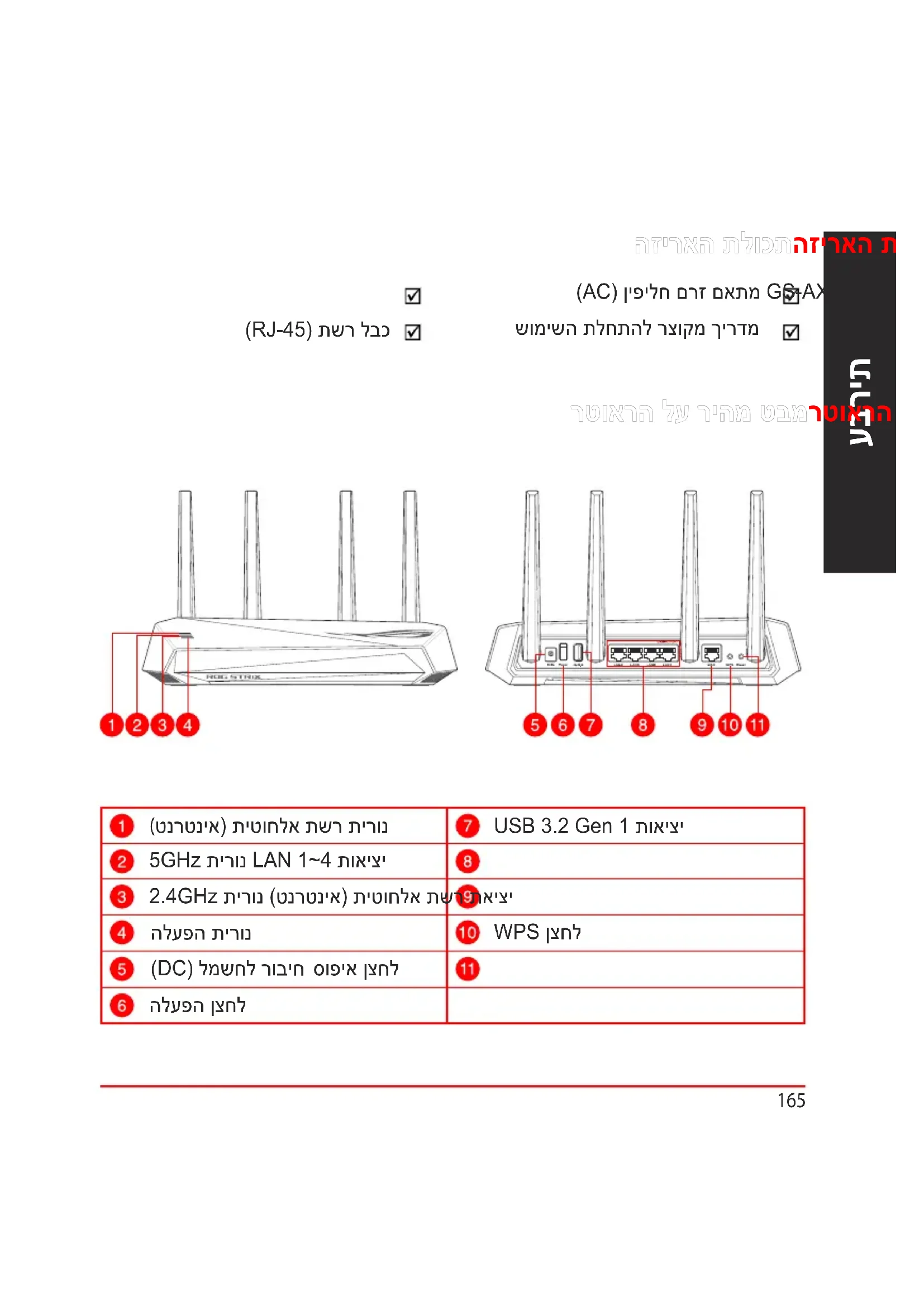 הזיראה תלוכתהזיראה תלוכת רטוארה לע ריהמ טבמרטוארה לע ריהמ טבמ )AC( ןיפילח םרז םאתמ GS-AX5400 יטוחלא רטואר שומישה תלחתהל רצוקמ ךירדמ )RJ-45( תשר לבכ (טנרטניא( תיטוחלא תשר תירונ USB 3.2 Gen 1 תואיצי 5GHz תירונ LAN 1~4 תואיצי 2.4GHz תירונ )טנרטניא( תיטוחלא תשר תאיצי הלעפה תירונ WPS ןצחל )DC( למשחל רוביח סופיא ןצחל הלעפה ןצחל166