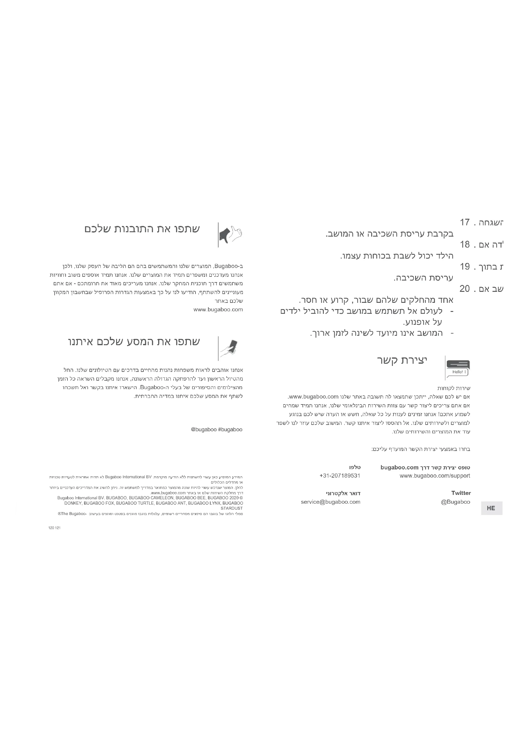+31-207189531 ינורטקלא ראוד service@bugaboo.com bugaboo.com ךרד רשק תריצי ספוט www.bugaboo.com/support Twitter @Bugaboo 17 . החגשה אלל קחשל םירחא םידליל רשפאל ןיא .בשומה וא הביכשה תסירע תברקב 18 . םא הדלשה אלל הביכשה תסירעב שמתשהל ןיא .ומצע תוחוכב תבשל לוכי דליה 19 . ךותב תושימגה האישנה תוידי תא ריאשהל ןיא .הביכשה תסירע 20 . םא בשומב וא הביכשה תסירעב שמתשהל ןיא .רסח וא עורק ,רובש םהלש םיקלחהמ דחא םידלי ליבוהל ידכ בשומב שמתשת לא םלועל -