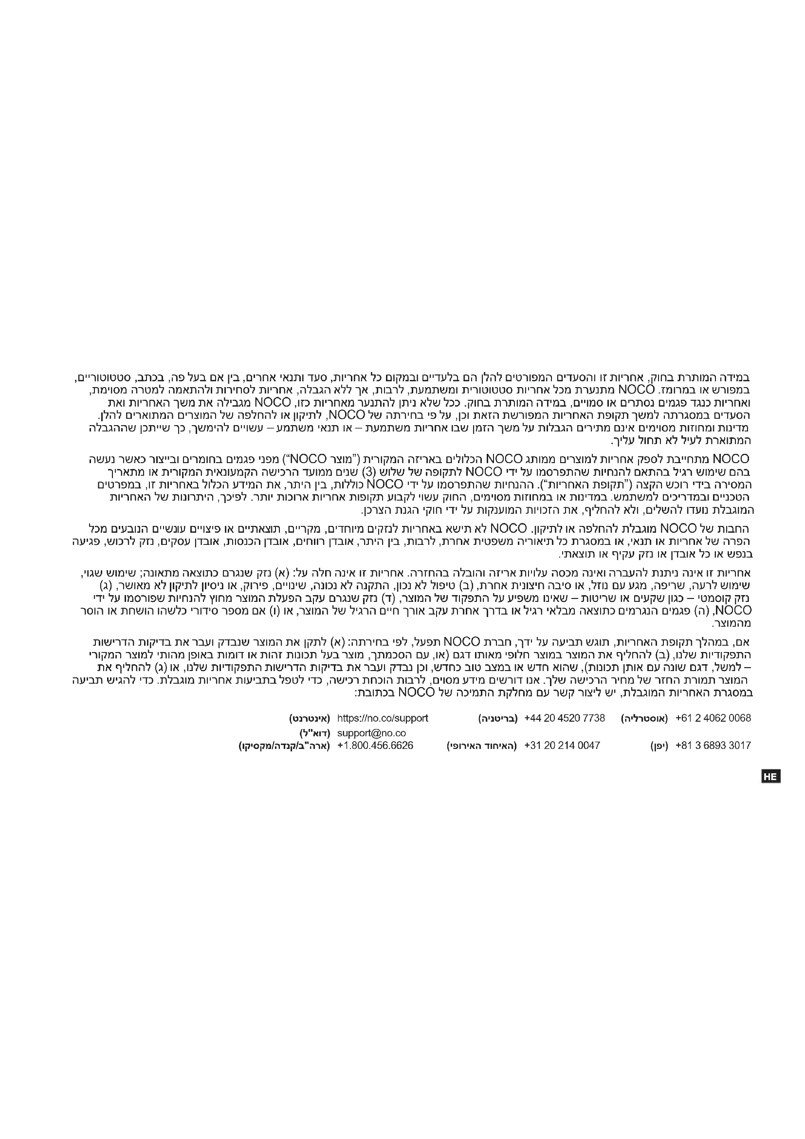 (US/CA/MX) https://no.co/support support@no.co +1.800.456.6626 (UK) (EU) (AU) (JP) +44 20 4520 7738 +31 20 214 0047 +61 2 4062 0068 +81 3 6893 3017HE ,םיירוטוטטס ,בתכב ,הפ לעב םא ןיב ,םירחא יאנתו דעס ,תוירחא לכ םוקמבו םיידעלב םה ןלהל םיטרופמה םידעסהו וז תוירחא ,קוחב תרתומה הדימב ,תמיוסמ הרטמל המאתהלו תוריחסל תוירחא ,הלבגה אלל ךא ,תוברל ,תעמתשמו תירוטוטטס תוירחא לכמ תרענתמ NOCO .זמורמב וא שרופמב תאו תוירחאה ךשמ תא הליבגמ NOCO ,וזכ תוירחאמ רענתהל ןתינ אלש לככ .קוחב תרתומה הדימב ,םייומס וא םירתסנ םימגפ דגנכ תוירחאו .ןלהל םיראותמה םירצומה לש הפלחהל וא ןוקיתל ,NOCO לש התריחב יפ לע ,ןכו תאזה תשרופמה תוירחאה תפוקת ךשמל התרגסמב םידעסה הלבגההש ןכתייש ךכ ,ךשמיהל םייושע – עמתשמ יאנת וא – תעמתשמ תוירחא ובש ןמזה ךשמ לע תולבגה םיריתמ םניא םימיוסמ תוזוחמו תונידמ .ךילע לוחת אל ליעל תראותמה