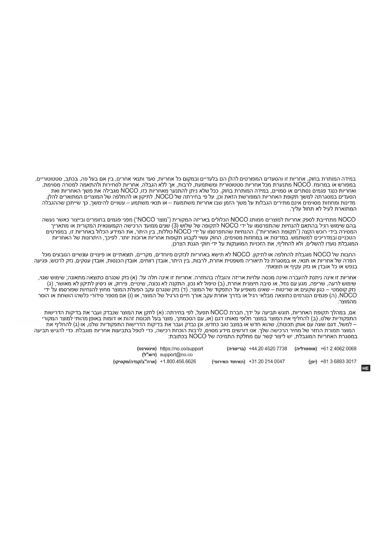 (US/CA/MX) https://no.co/support support@no.co +1.800.456.6626 (UK) (EU) (AU) (JP) +44 20 4520 7738 +31 20 214 0047 +61 2 4062 0068 +81 3 6893 3017HE ,םיירוטוטטס ,בתכב ,הפ לעב םא ןיב ,םירחא יאנתו דעס ,תוירחא לכ םוקמבו םיידעלב םה ןלהל םיטרופמה םידעסהו וז תוירחא ,קוחב תרתומה הדימב ,תמיוסמ הרטמל המאתהלו תוריחסל תוירחא ,הלבגה אלל ךא ,תוברל ,תעמתשמו תירוטוטטס תוירחא לכמ תרענתמ NOCO .זמורמב וא שרופמב תאו תוירחאה ךשמ תא הליבגמ NOCO ,וזכ תוירחאמ רענתהל ןתינ אלש לככ .קוחב תרתומה הדימב ,םייומס וא םירתסנ םימגפ דגנכ תוירחאו .ןלהל םיראותמה םירצומה לש הפלחהל וא ןוקיתל ,NOCO לש התריחב יפ לע ,ןכו תאזה תשרופמה תוירחאה תפוקת ךשמל התרגסמב םידעסה הלבגההש ןכתייש ךכ ,ךשמיהל םייושע – עמתשמ יאנת וא – תעמתשמ תוירחא ובש ןמזה ךשמ לע תולבגה םיריתמ םניא םימיוסמ תוזוחמו תונידמ .ךילע לוחת אל ליעל תראותמה