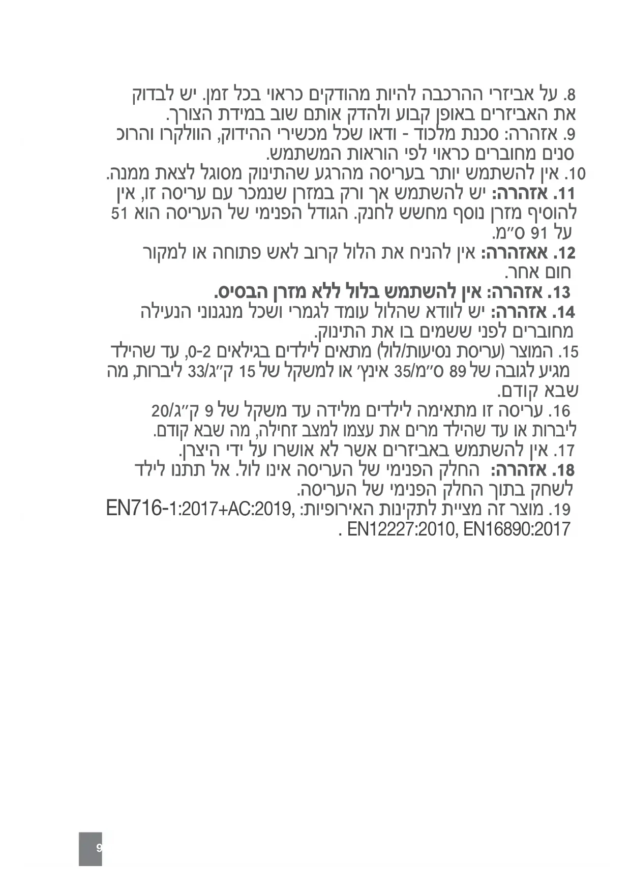 20/ג"ק 9 לש לקשמ דע הדילמ םידליל המיאתמ וז הסירע .16 .םדוק אבש המ ,הליחז בצמל ומצע תא םירמ דליהש דע וא תורביל .ןרציה ידי לע ורשוא אל רשא םירזיבאב שמתשהל ןיא .17 דליל ונתת לא .לול וניא הסירעה לש ימינפה קלחה :הרהזא .18 .הסירעה לש ימינפה קלחה ךותב קחשל EN716-1:2017+AC:2019, :תויפוריאה תוניקתל תייצמ הז רצומ .19 . EN12227:2010, EN16890:2017ΗΕ