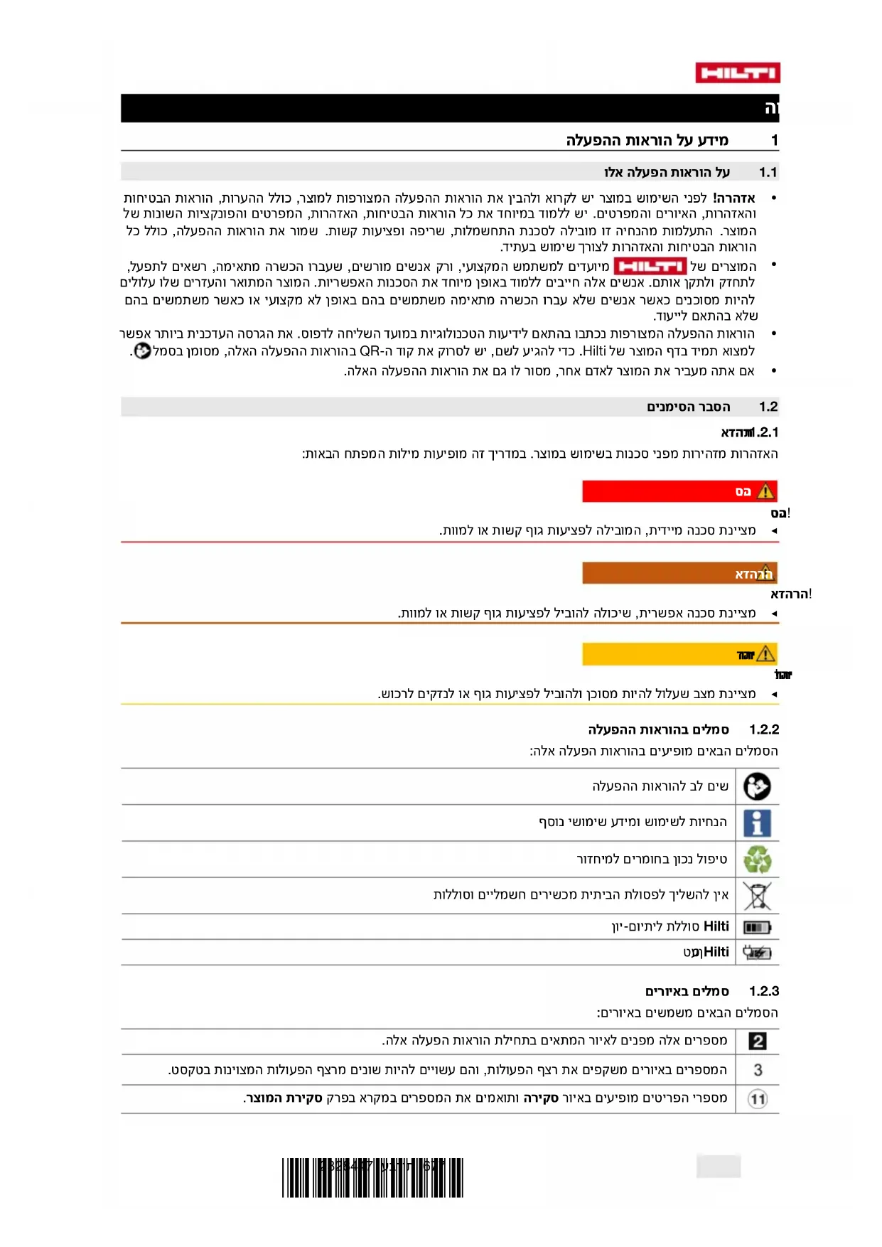 - הוראותההפעלההמצורפותנכתבובהתאםלידיעותהטכנולוגיותבמועדהשליחהלדפוס.אתהגרסההעדכניתביותראפשר למצואתמידבדףהמוצרשלHilti.כדילהגיעלשם,ישלסרוקאתקודה-QRבהוראותההפעלההאלה,מסומןבסמל.