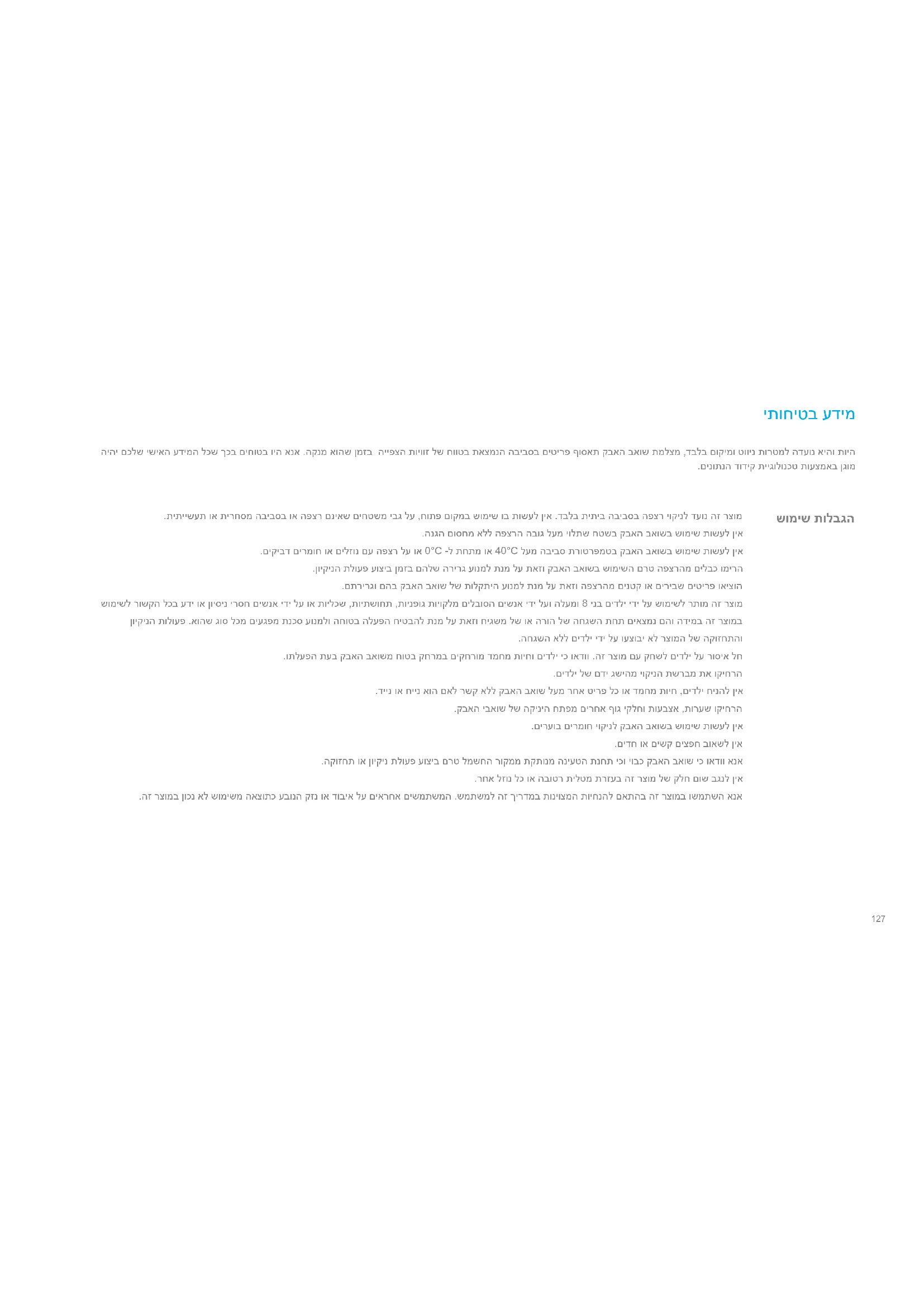 יתוחיטב עדימ שומיש תולבגה .תיתיישעת וא תירחסמ הביבסב וא הפצר םניאש םיחטשמ יבג לע ,חותפ םוקמב שומיש וב תושעל ןיא .דבלב תיתיב הביבסב הפצר יוקינל דעונ הז רצומ .הנגה םוסחמ אלל הפצרה הבוג לעמ יולתש חטשב קבאה באושב שומיש תושעל ןיא .םיקיבד םירמוח וא םילזונ םע הפצר לע וא 0°C -ל תחתמ וא 40°C לעמ הביבס תרוטרפמטב קבאה באושב שומיש תושעל ןיא .ןויקינה תלועפ עוציב ןמזב םהלש הרירג עונמל תנמ לע תאזו קבאה באושב שומישה םרט הפצרהמ םילבכ ומירה .םתרירגו םהב קבאה באוש לש תולקתיה עונמל תנמ לע תאזו הפצרהמ םינטק וא םיריבש םיטירפ ואיצוה שומישל רושקה לכב עדי וא ןויסינ ירסח םישנא ידי לע וא תוילכש ,תויתשוחת ,תוינפוג תויוקלמ םילבוסה םישנא ידי לעו הלעמו 8 ינב םידלי ידי לע שומישל רתומ הז רצומ ןויקינה תולועפ .אוהש גוס לכמ םיעגפמ תנכס עונמלו החוטב הלעפה חיטבהל תנמ לע תאזו חיגשמ לש וא הרוה לש החגשה תחת םיאצמנ םהו הדימב הז רצומב .החגשה אלל םידלי ידי לע ועצובי אל רצומה לש הקוזחתהו .ותלעפה תעב קבאה באושמ חוטב קחרמב םיקחרומ דמחמ תויחו םידלי יכ ואדוו .הז רצומ םע קחשל םידלי לע רוסיא לח .םידלי לש םדי גשיהמ יוקינה תשרבמ תא וקיחרה .דיינ וא חיינ אוה םאל רשק אלל קבאה באוש לעמ רחא טירפ לכ וא דמחמ תויח ,םידלי חינהל ןיא .קבאה יבאוש לש הקיניה חתפמ םירחא ףוג יקלחו תועבצא ,תורעש וקיחרה .םירעוב םירמוח יוקינל קבאה באושב שומיש תושעל ןיא .םידח וא םישק םיצפח בואשל ןיא .הקוזחת וא ןויקינ תלועפ עוציב םרט למשחה רוקממ תקתונמ הניעטה תנחת יכו יובכ קבאה באוש יכ ואדוו אנא .רחא לזונ לכ וא הבוטר תילטמ תרזעב הז רצומ לש קלח םוש בגנל ןיא .הז רצומב ןוכנ אל שומישמ האצותכ עבונה קזנ וא דוביא לע םיארחא םישמתשמה .שמתשמל הז ךירדמב תוניוצמה תויחנהל םאתהב הז רצומב ושמתשה אנא היהי םכלש ישיאה עדימה לכש ךכב םיחוטב ויה אנא .הקנמ אוהש ןמזב הייפצה תויווז לש חווטב תאצמנה הביבסב םיטירפ ףוסאת קבאה באוש תמלצמ ,דבלב םוקימו טווינ תורטמל הדעונ איהו תויה .םינותנה דודיק תייגולונכט תועצמאב ןגומ128 הניעטו תוללוס .RCS0 םגד חוכ קפסב קר ושמתשה .ישילש דצ הניעט תדמעב וא ןעטמב ,הללוסב שומיש תושעל ןיא .םכמצעב הניעטה תדמעב וא הללוסב םייוניש עצבל וא ןקתל ,קרפלו תוסנל ןיא .םוח רוקמ תברקב הניעטה תדמע תא םקמל ןיא .הניעטה תדמע לש הניעטה יעגמ יוקינל וא בוגינל תובוטר םיידיב וא הבוטר תילטמב שומיש תושעל ןיא .םיאתמ רוזחמ ןקתמב ךילשהל שי תוישומיש אל תוללוס .הנוכנ אלו החוטב אל הרוצב תונשי תוללוש ךילשהל ןיא .הריכמ רחאל תורישה זכרמ םע רשק ורצו רצומב שומישה תא דימ וקיספה ,לקלקתמ וא םגפנ למשחה לבכו הדימב .ןתינה לככ ולש ירוקמה זראמב ותוא ורמשל וגאדו םוקמל םוקממ ותלבוה תעב יובכ קבאה באוש יכ ואדוו אנא באוש תא שדחמ וניעטה .שביו רירק םוקמב ותוא ונסחאו ותוא ובכ ןכמ רחאל ,ואולמב ותוא וניעטה ,ךשוממ ןמז קרפ ךשמל קבאה באושב שומיש תושעל הנווכ ןיאו הדימב .הללוסה לש רתי תניעט עונמל תנמ לע תאזו םישדוח 3-ב םעפ תוחפה לכל קבאה .דבלב הריכמ רחאל תוריש זכרמ ידי לע וא םיכמסומ םיאנכט ידי לע הפלחהל תונתינה תוללוס ללוכ הז רצומ יתוחיטב עדימ129 רצומה תריקס