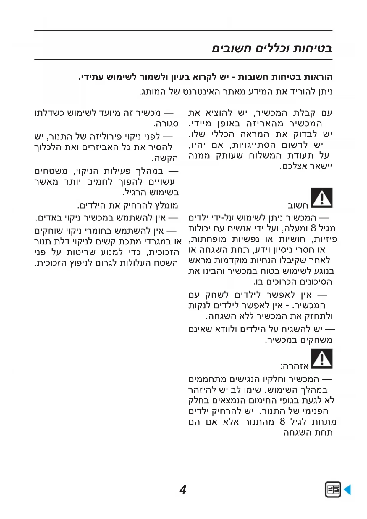 םידלי ידי-לע שומישל ןתינ רישכמה — תולוכי םע םישנא ידי לעו ,הלעמו 8 ליגמ ,תותחפומ תוישפנ וא תוישוח ,תויזיפ וא החגשה תחת ,עדיו ןויסינ ירסח וא שארמ תומדקומ תויחנה ולביקש רחאל תא וניבהו רישכמב חוטב שומישל עגונב .וב םיכורכה םינוכיסה םע קחשל םידליל רשפאל ןיא — תוקנל םידליל רשפאל ןיא - .רישכמה .החגשה אלל רישכמה תא קזחתלו םניאש אדוולו םידליה לע חיגשהל שי — .רישכמב םיקחשמ