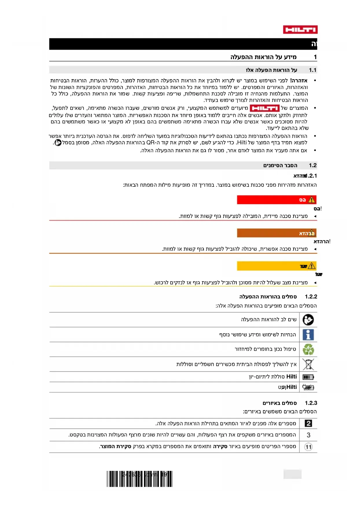 如对保修条件有任何疑问,请联系您当地的 Hilti 代表。*247636* 247636 עברית 191 הוראותהפעלהמקוריות 1מידעעלהוראותההפעלה 1.1עלהוראותהפעלהאלו