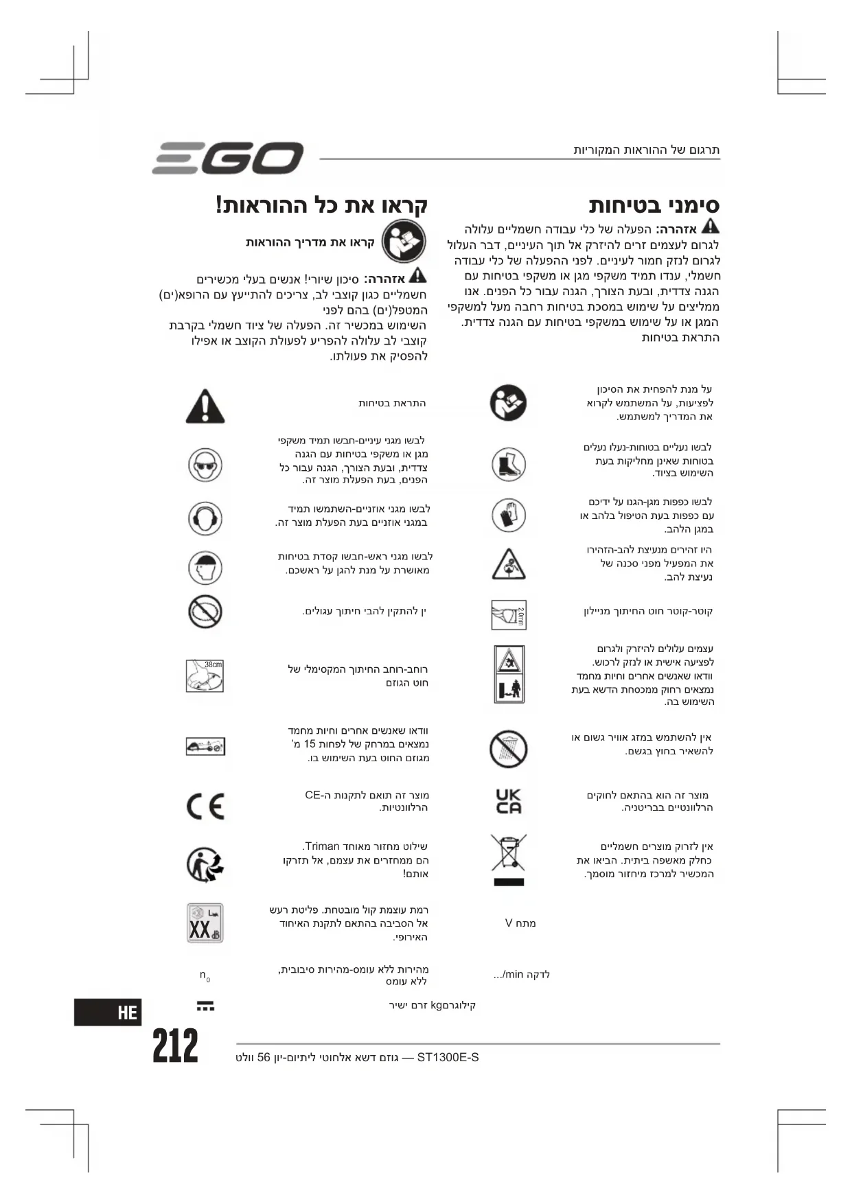 ST1300ES - גוזם דשא EGO - מדריך משתמש חינמי