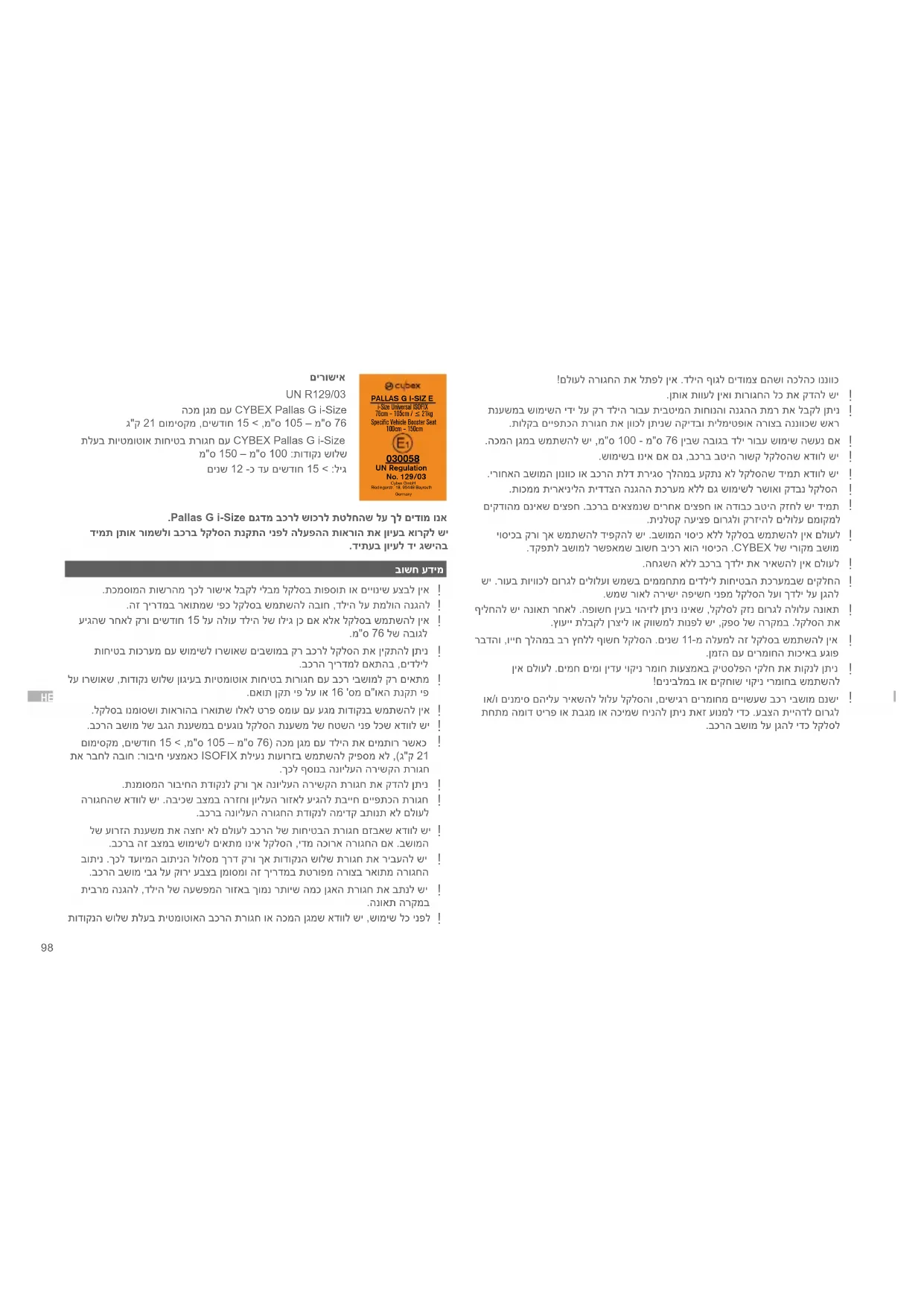 UN R129/03 הכמ ןגמ םע CYBEX Pallas G i-Size ג"ק 21 םומיסקמ ,םישדוח 15 > ,מ"ס 105 – מ"ס 76 תלעב תויטמוטוא תוחיטב תרוגח םע CYBEX Pallas G i-Size מ"ס 150 – מ"ס 100 :תודוקנ שולש םינש 12 -כ דע םישדוח 15 > :ליג