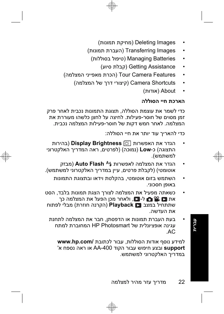 ) Display Brightnessבהירות הגדר את האפשרות התצוגה( כ) Low-נמוכה( )לפרטים ,ראה המדריך האלקטרוני למשתמש(. הגדר את המצלמה לאפשרות ) Auto Flashמבזק אוטומטי( )לקבלת פרטים ,עיין במדריך האלקטרוני למשתמש(. השתמש בזום אוטומטי ,בהקלטת וידאו ובתצוגת התמונות באופן חסכוני. כשאתה מפעיל את המצלמה לצורך הצגת תמונות בלבד ,הסט ל , -ולאחר מכן הפעל את המצלמה כך את שתתחיל במצב ) Playbackהקרנה חוזרת( מבלי לפתוח את העדשה. בעת העברת תמונות או הדפסתן ,חבר את המצלמה לתחנת עגינה אופציונלית של HP Photosmartהמחוברת למתח .AC