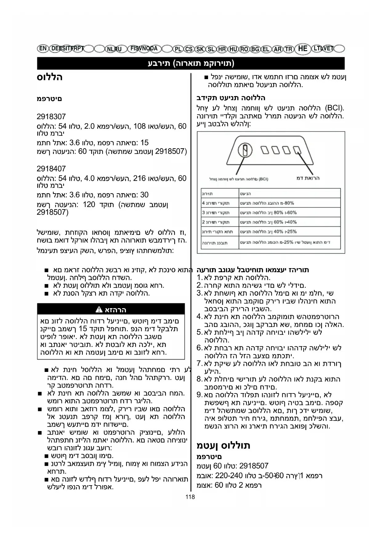 - השתמש רק בסוללות ליתיום-יון נטענות 2918307 / 2918407. השלכה של הסוללה באופן בטיחותי לסביבה החומרים הרעילים והמאכלים נמצאים בסוללות שבהן נעשה שימוש בסוללת הכלי הזאת: ליתיום-יון, חומר רעיל.