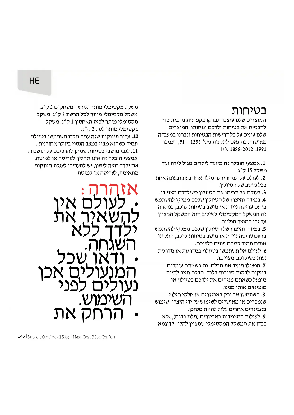 ידכ תיברמ תונדפקב וקדבנו ובצוע ונלש םירצומה םירצומה .ותוחונו םכדלי תוחיטב תא חיטבהל הדבעמב ונחבנו תוחיטבה תושירד לכ לע םינוע ונלש רבמצד ,91 – 1292 ’סמ תונקתל םאתהב תרשואמ .EN 1888:2012 ,1991 דעו הדיל ליגמ םידליל דעוימ הז הלבוה יעצמא .1 .ג”ק 15 לקשמ תחא הנועבו תעב דחא דלימ רתוי וחינת לע םלועל .2 .ןולויטה לש בשומ לכב .וב יוצמ םכדלישכ ןולויטה תא ומירת לא םלועל .3 שמתשהל ץילממ םכלש ןולויטה לש ןרציהו הדימב .4 הרקמב ,בכרל תוחיטב בשומ וא תדיינ הסירע םע וב ןיוצמה לקשמה אוה בולישל ילמיסקמה לקשמה הז .הוולנה רצומה יבג לע שמתשהל ץילממ םכלש ןולויטה לש ןרציהו הדימב .5 וניקתה ,בכרל תוחיטב בשומ וא תדיינ הסירע םע וב .םכיפלכ םינופ םהשכ דימת םתוא תוגרדמ וא תוגרדמב ןולויטב ושמתשת לא םלועל .6 .וב יוצמ םכדלישכ תוענ םידמוע םתאשכ םג ,םלבה תא דימת וליעפה .7 תויהל בייח םלבה .דבלב תורופס תוקדל םוקמב וא ןולויטב םכדלי תא םיחינמ םתאשכ לעפומ .ונממ ותוא םיאיצומ ףוליח יקלח וא םירזיבאב קרו ךא ושמתשה .8 שומיש .ןרציה ידי לע שומישל םירשואמ וא םירכמנש .ןכוסמ תויהל לולע םירחא םירזיבאב אנא ,)םגדב יולת( םירזיבאב תודיוצמה תולגעל .9 אמגודל :ןלהל ןיוצמש ילמיסקמה לקשמה תא ודבכMaxi-Cosi, Bébé Confort