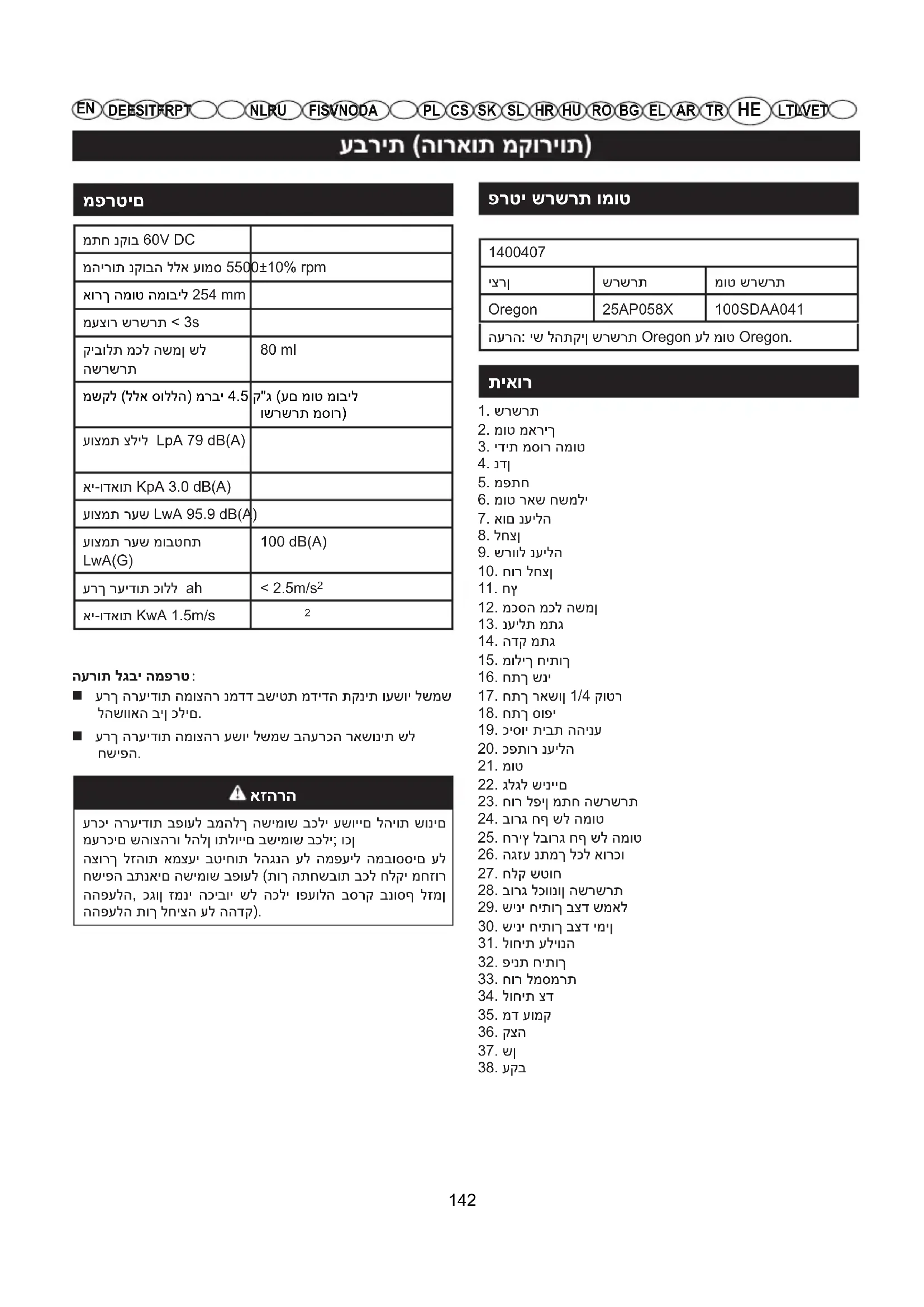 ערכי הרעידות בפועל במהלך השימוש בכלי עשויים להיות שונים מערכים שהוצהרו להלן ותלויים בשימוש בכלי; וכן הצורך לזהות אמצעי בטיחות להגנה על המפעיל המבוססים על חשיפה בתנאים השימוש בפועל (תוך התחשבות בכל חלקי מחזור ההפעלה, כגון זמני הכיבוי של הכלי ופעולה בסרק בנוסף לזמן ההפעלה תוך לחיצה על ההדק). פרטי שרשרת ומוט 1400407יצרן שרשרת מוט שרשרתOregon 25AP058X 100SDAA041הערה: יש להתקין שרשרת Oregon על מוט Oregon. 1. שרשרת2. מוט מאריך3. ידית מסור המוט4. נדן5. מפתח6. מוט ראש חשמלי7. אום נעילה8. לחצן9. שרוול נעילה10. חור לחצן11. חץ12. מכסה מכל השמן13. נעילת מתג14. הדק מתג15. מוליך חיתוך16. חתך שני17. חתך ראשון 1/4 קוטר18. חתך סופי19. כיסוי תיבת ההינע20. כפתור נעילה21. מוט22. גלגל שיניים23. חור לפין מתח השרשרת24. בורג חף של המוט25. חריץ לבורג חף של המוט26. הגזע נתמך לכל אורכו27. חלק שטוח28. בורג לכוונון השרשרת29. שיני חיתוך בצד שמאל30. שיני חיתוך בצד ימין31. לוחית עליונה32. פינת חיתוך33. חור למסמרת34. לוחית צד35. מד עומק36. קצה37. שן38. עקב 142TR